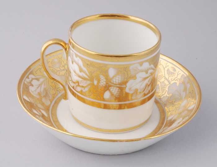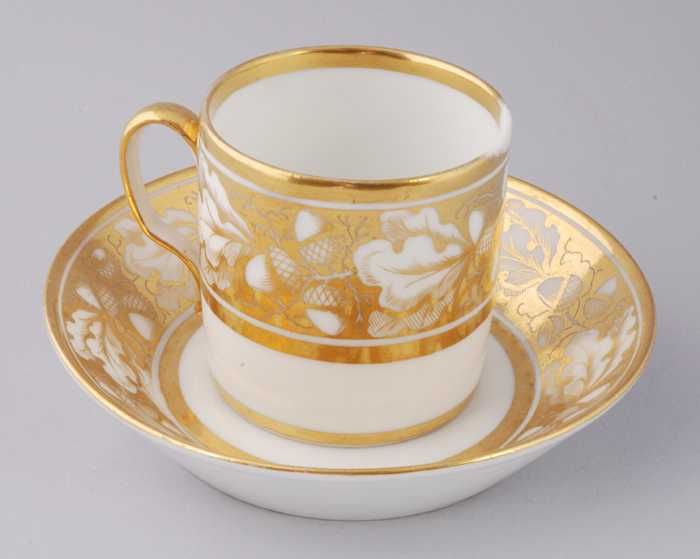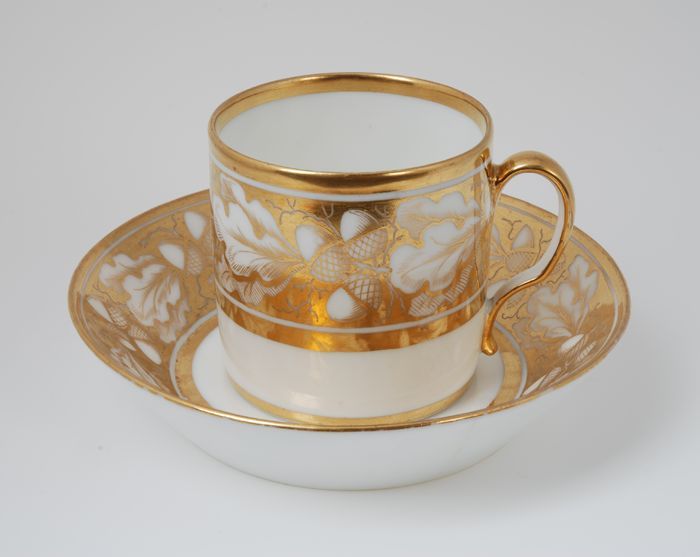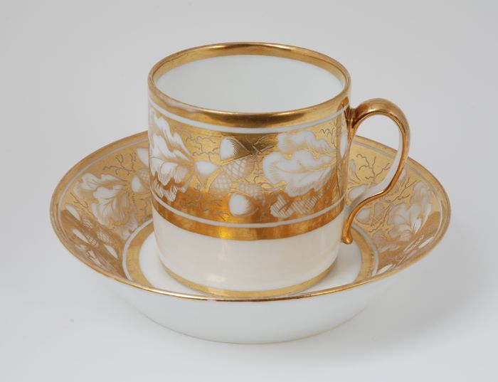 Witte melkkan met goudkleurige randen en bloem, eike...