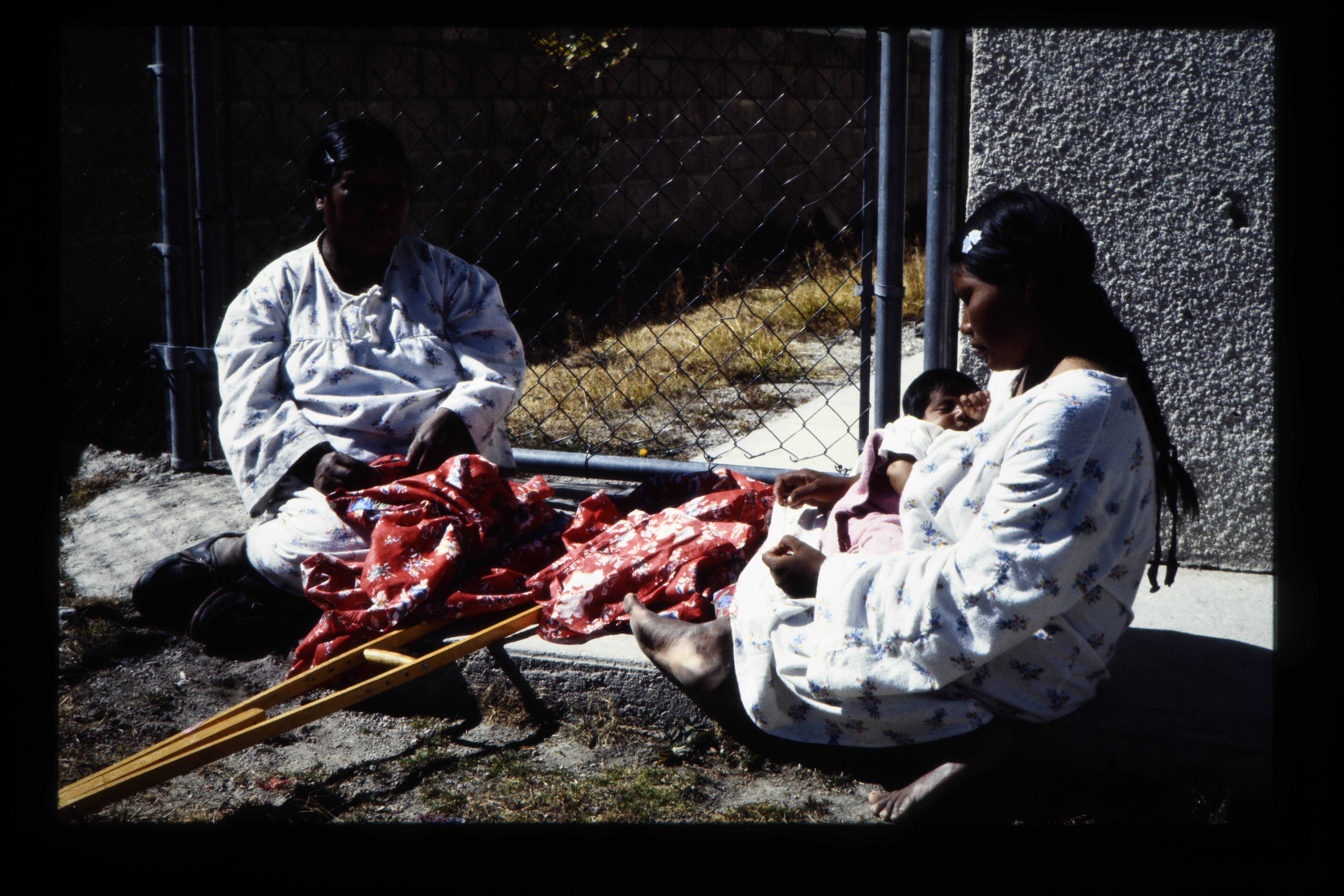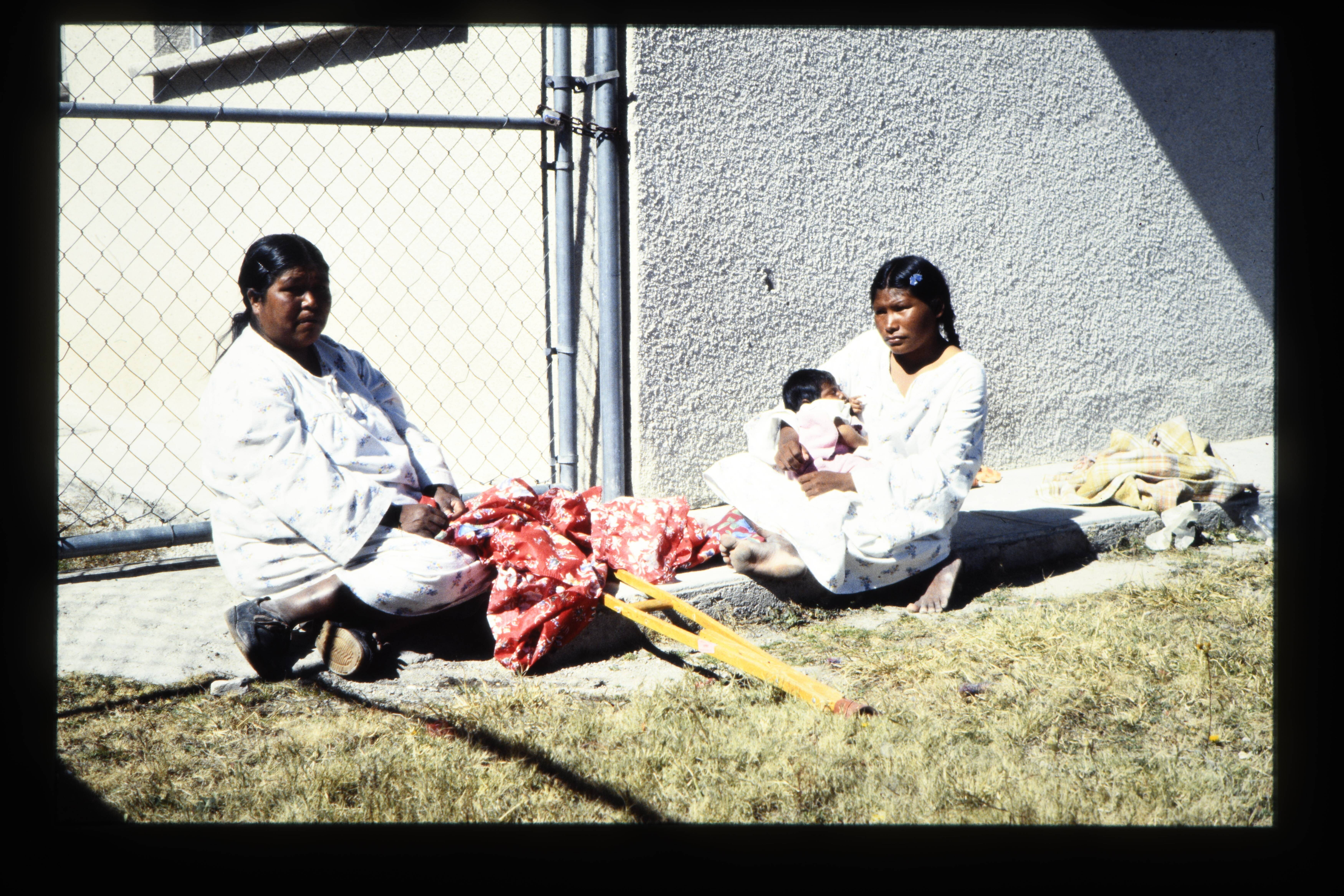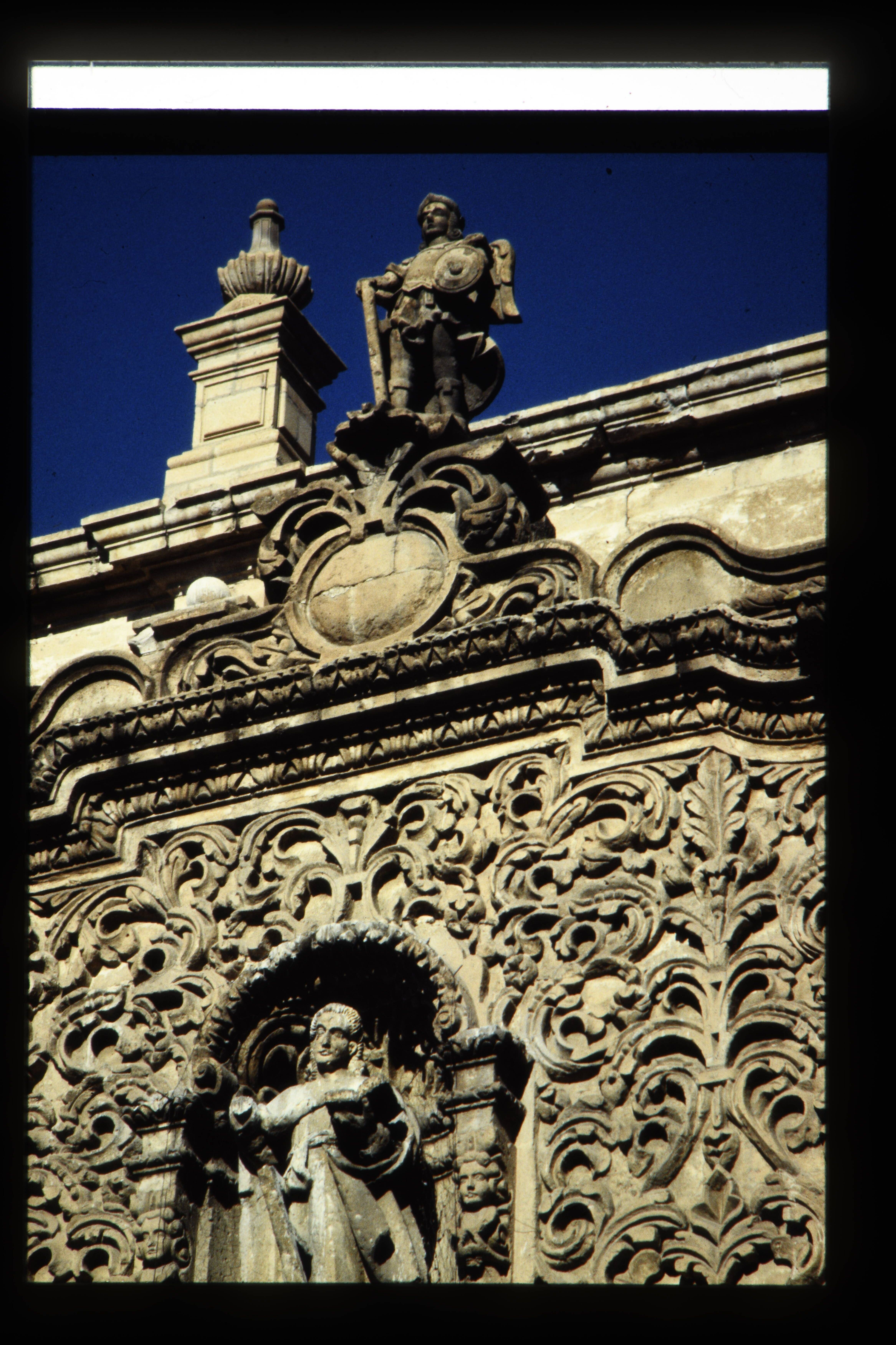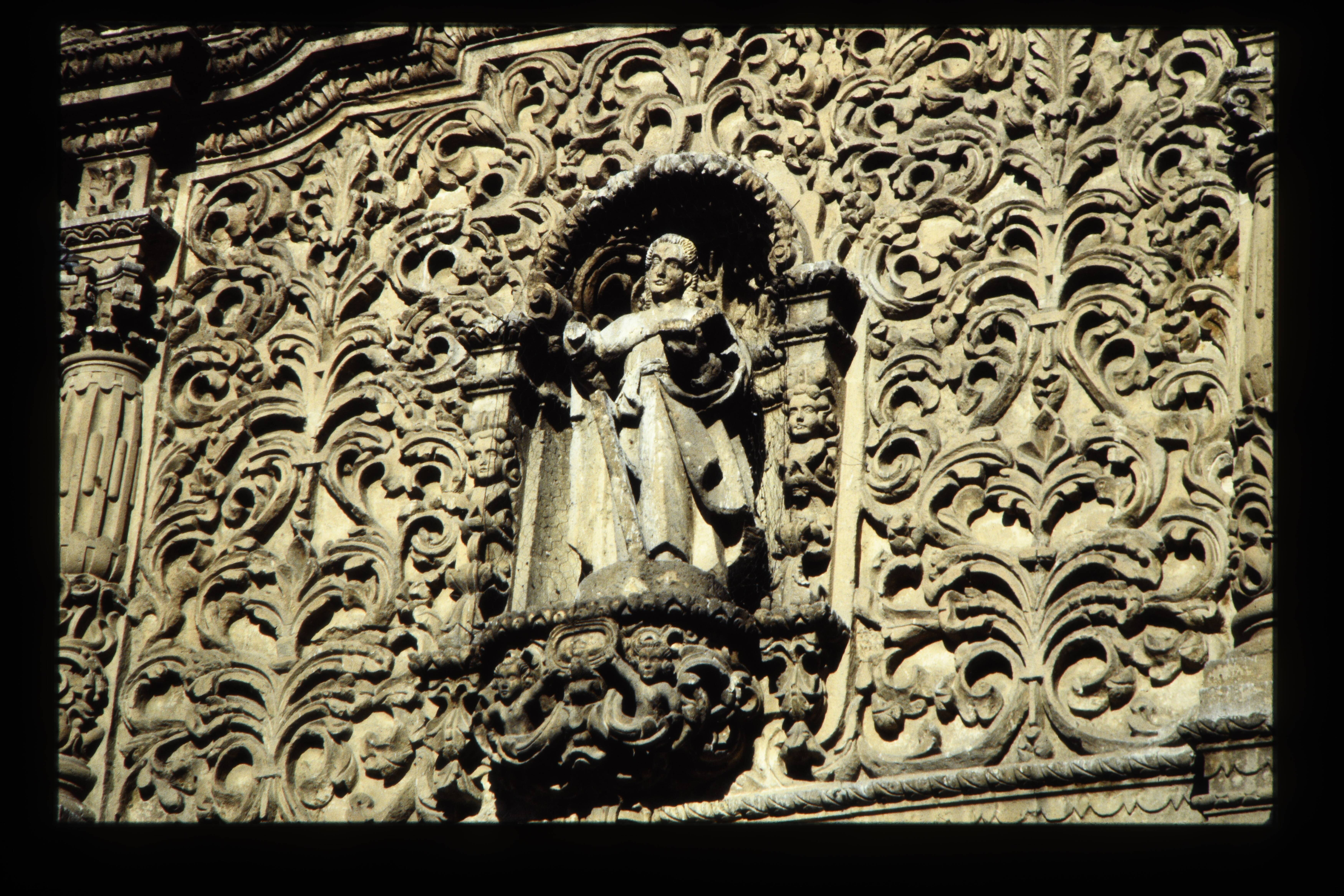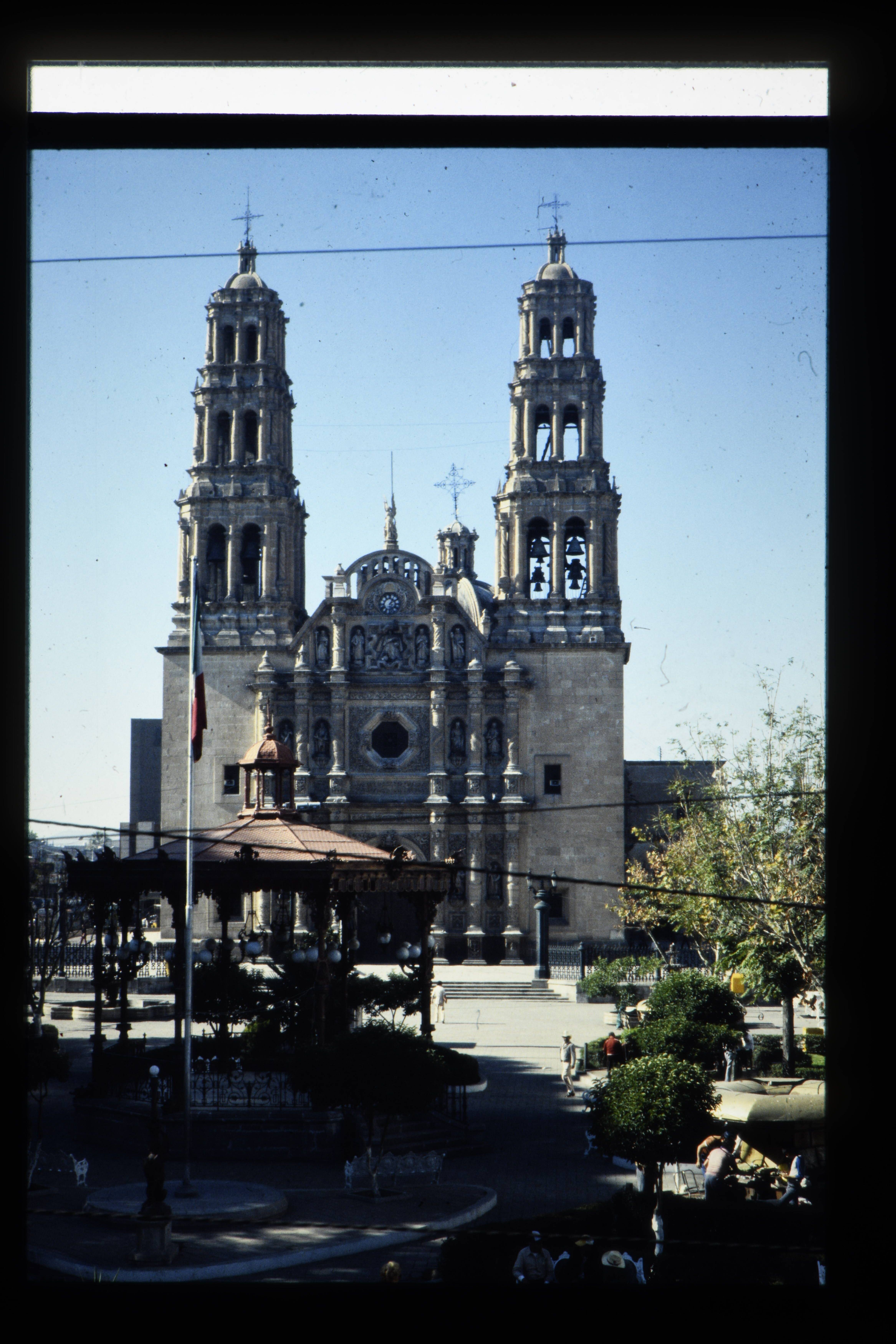 'Detail kathedraal in Chihuahua, bedelaar aan ingang.'