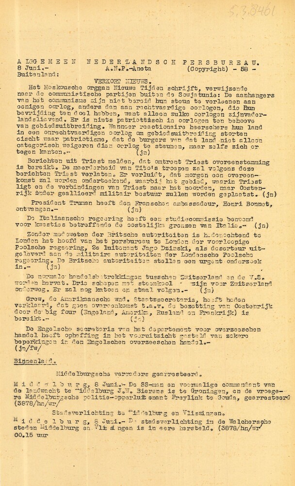 Vel: Algemeen Nederlandsch Persbureau, mededelingen,...