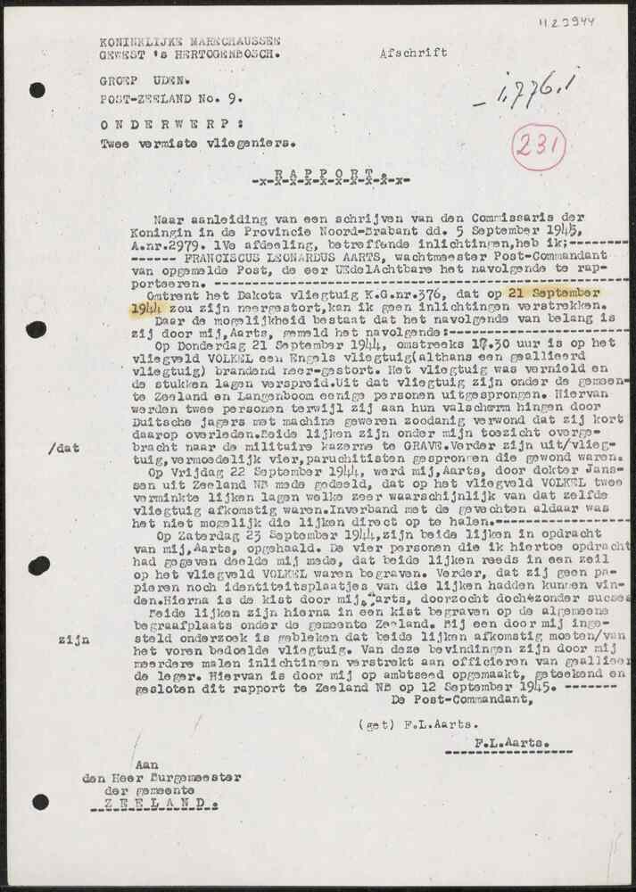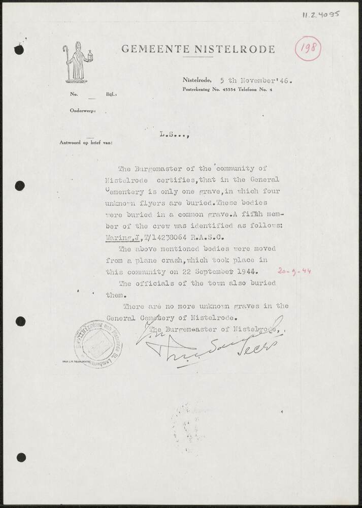 Brief van de Burgemeester van Nistelrode, 5 november...
