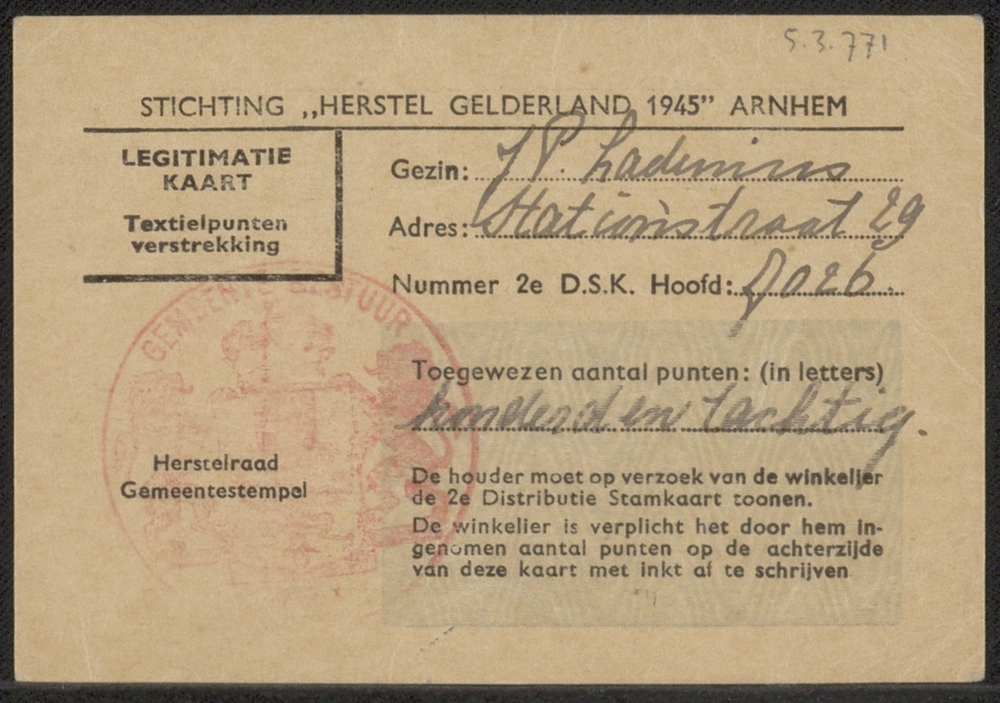 Legitimatiekaart Stichting "Herstel Gelderland 1945"...