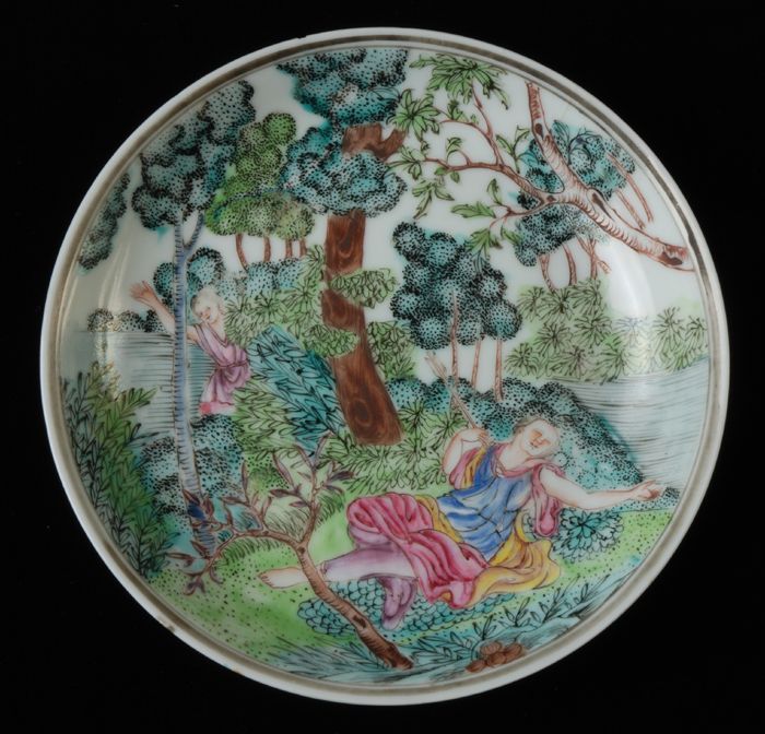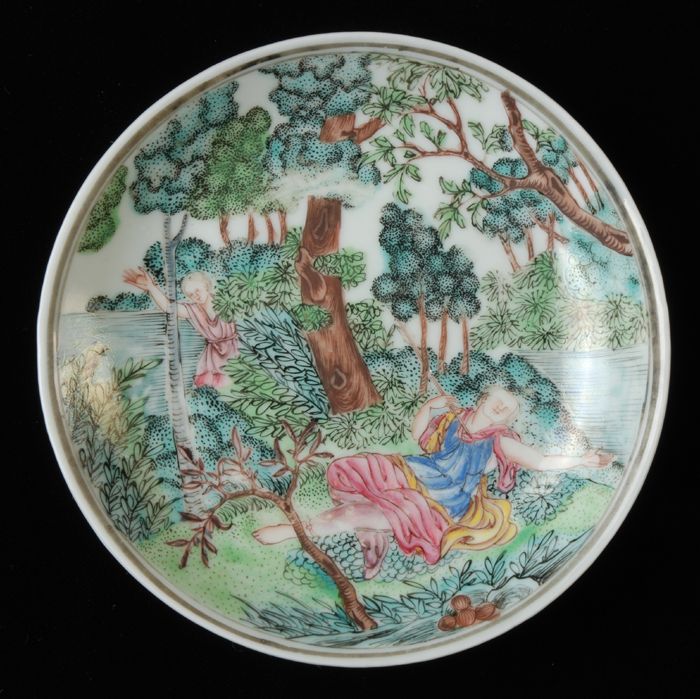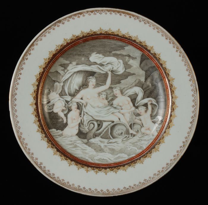 Wit bord met drie naakte vrouwen en drie putti op zee