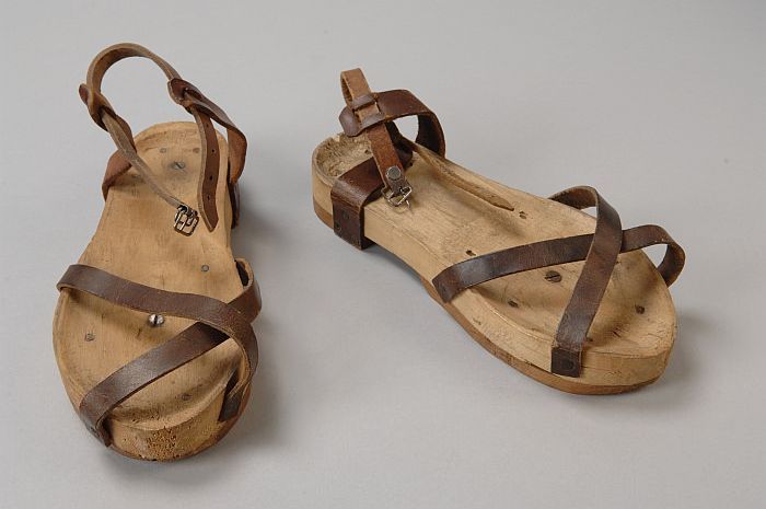 Houten sandalen met leren teen en enkelbanden, gesps...