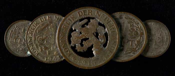 Verzilverde broche vervaardigd uit vijf bronzen munten