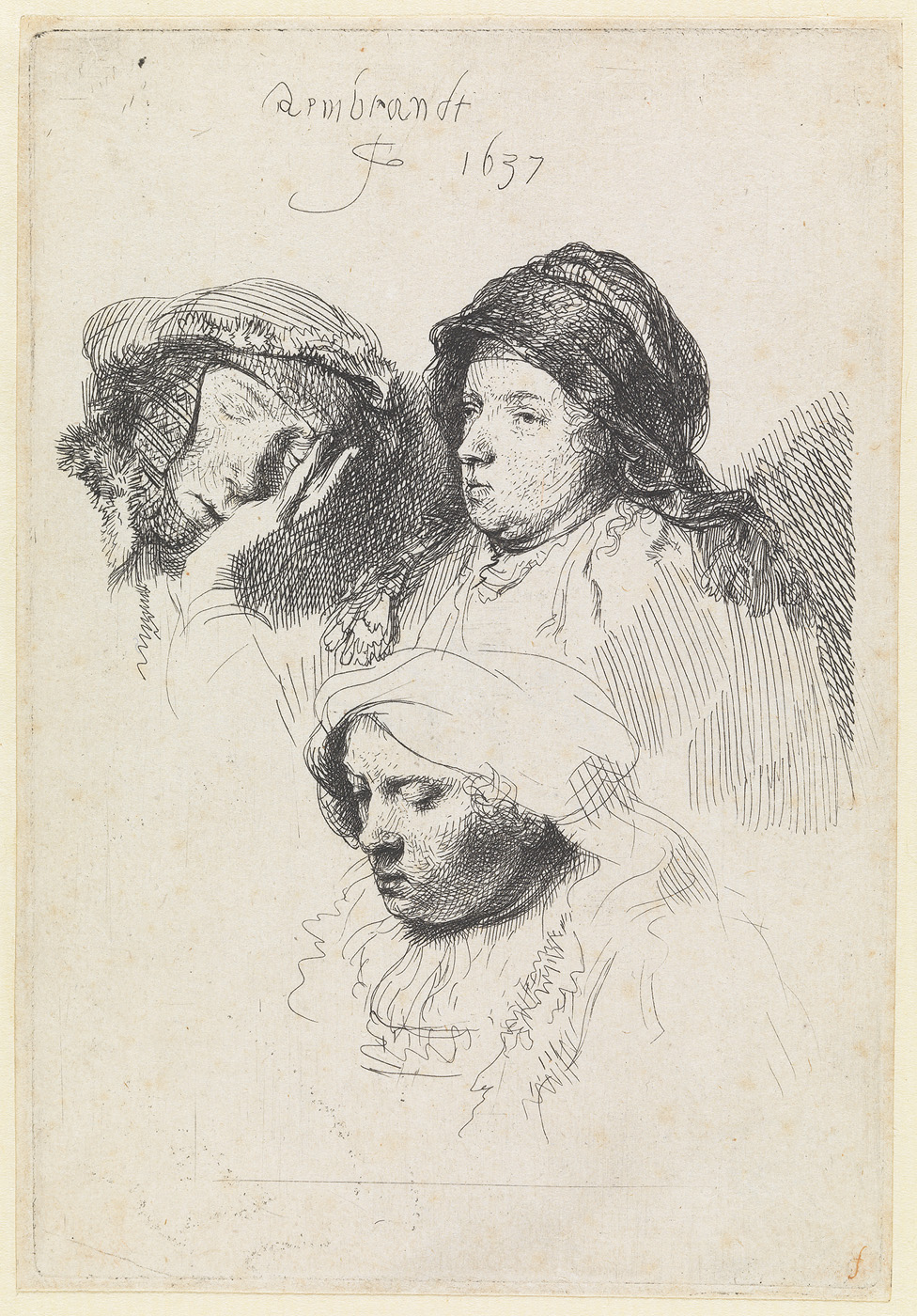 Drie vrouwenkoppen, één zeer licht geëtst