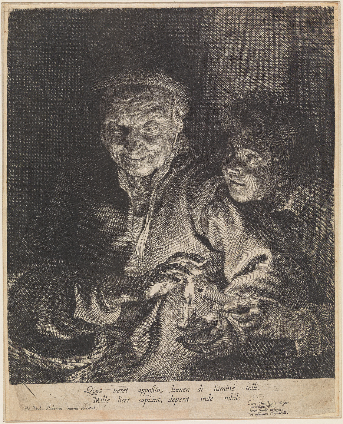 Eene oude vrouw en een jongen bij kaarslicht