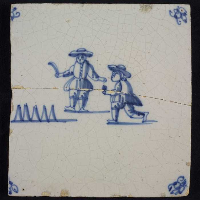 Tafereeltegel, twee kegelende jongens met hoed, hoek...