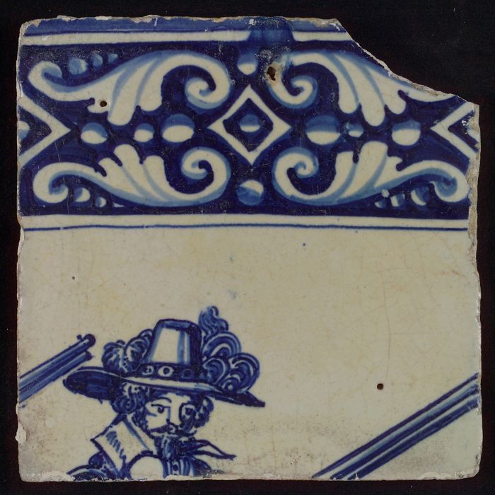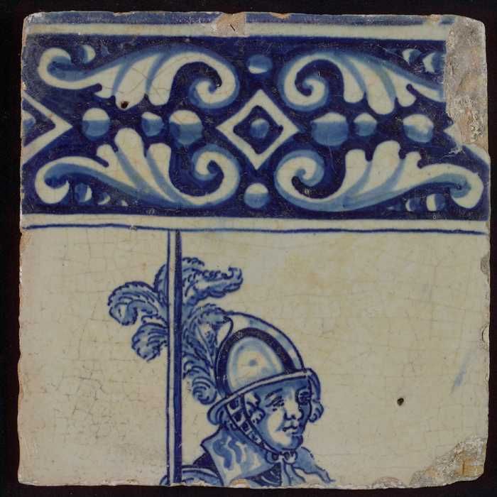 Tegel van tableau met gedecoreerde bovenrand en man ...