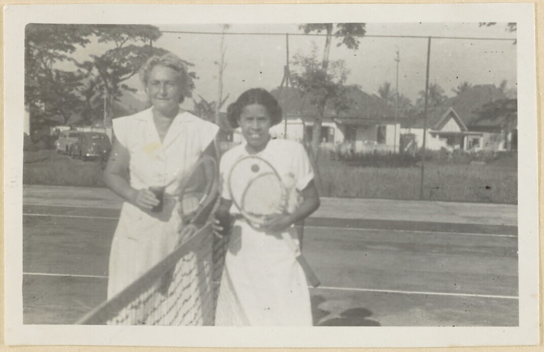 Europese en Javaanse vrouw opde tennisbaan van de Ba...