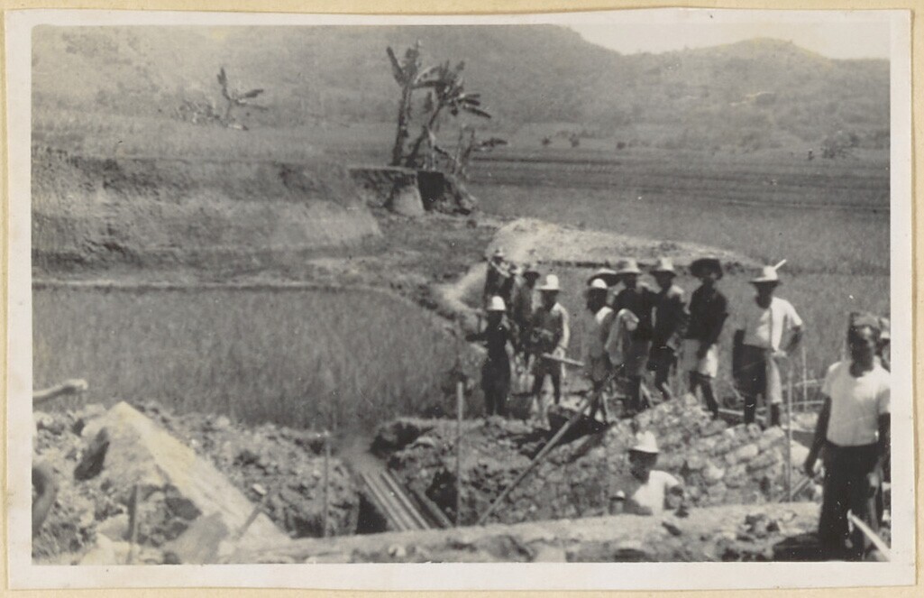 Javaanse arbeiders werkzaam bij de aanleg van een br...