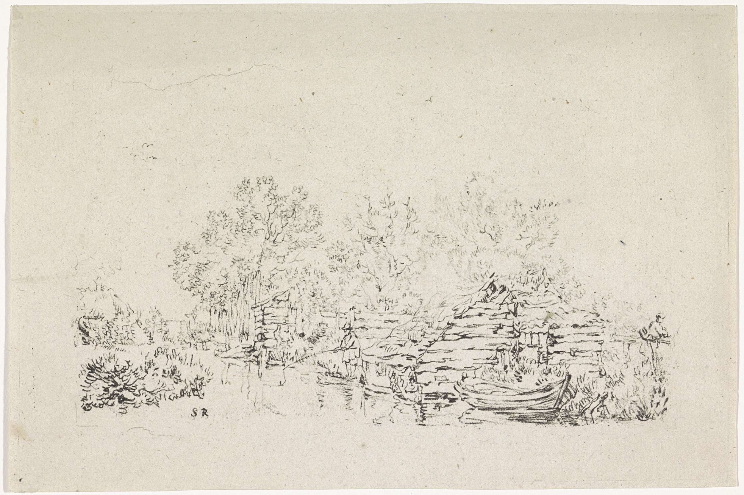 Rivierlandschap met een brug en een windmolen