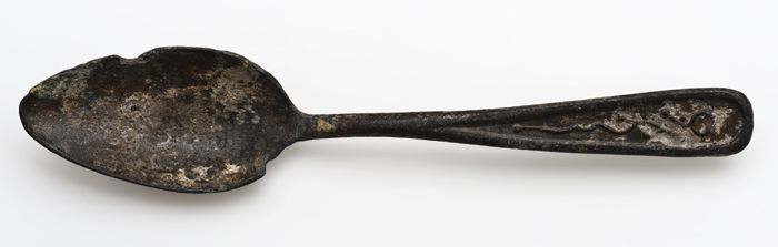 Steelfragment van tinnen lepel, gemerkt