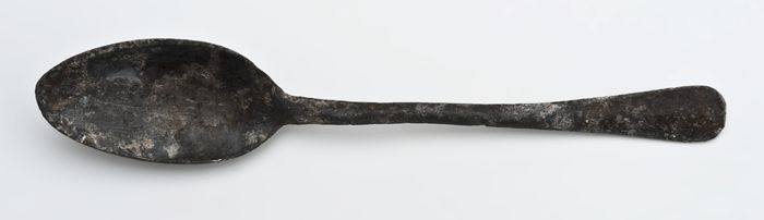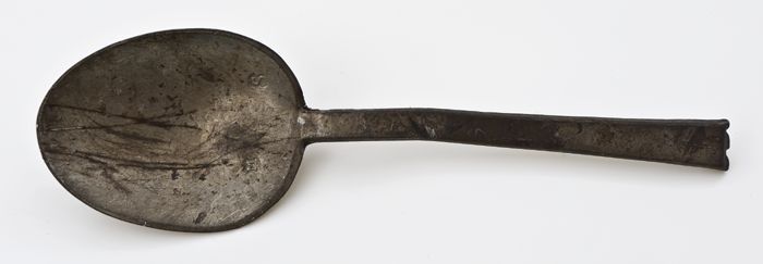 Tinnen lepel met ovale bak, platte steel en twee kep...