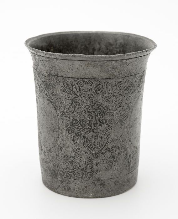 Cilindervormige tinnen beker met decoratie in reliëf
