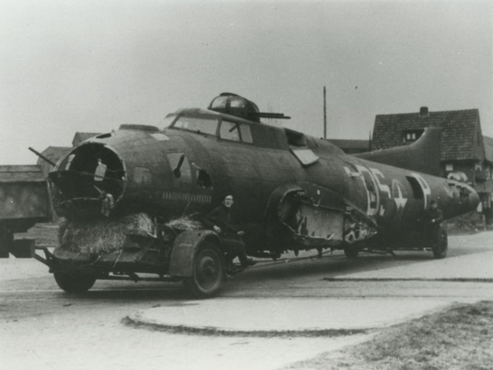 Foto van formatie C-47 Dakotas boven fabriek. Tekst ...