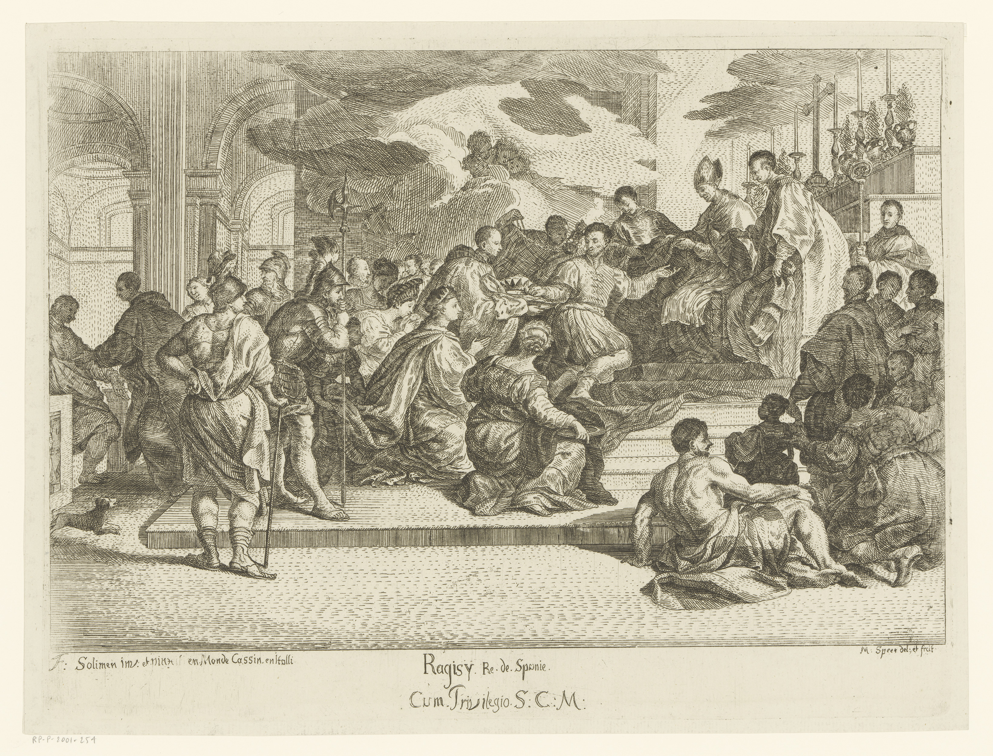 Getroonde Spaanse bisschop met een groep geknielde f...