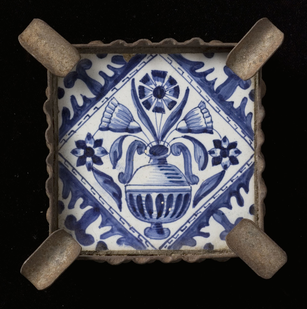 Asbak met tegel in tinglazuur, voorstellende bloempo...