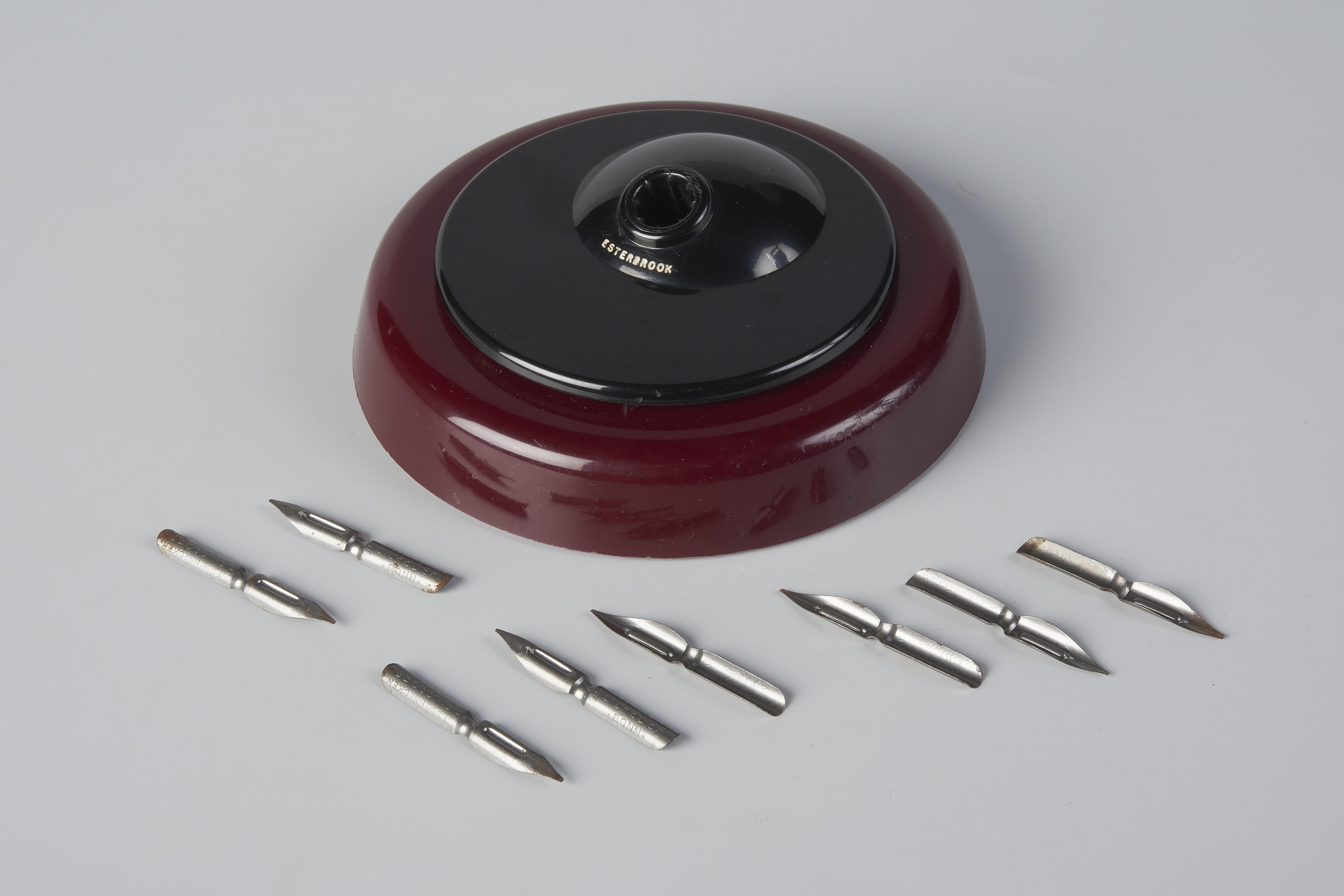 Inktpot en acht kroontjespennen, circa 1965
