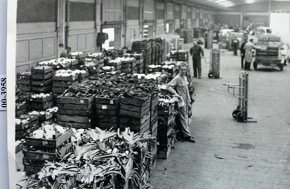 bij de kisten in de veilinghal in de Laak