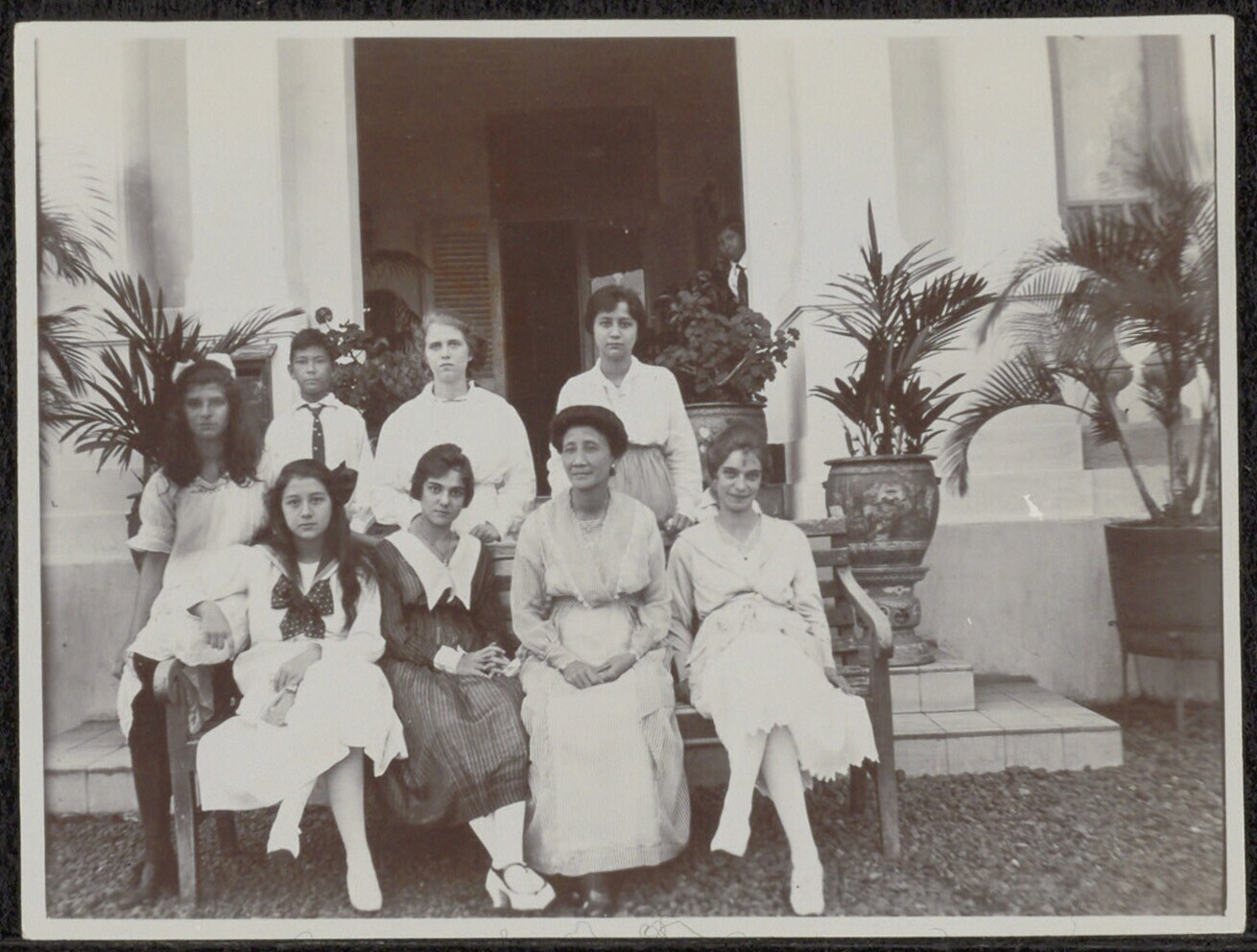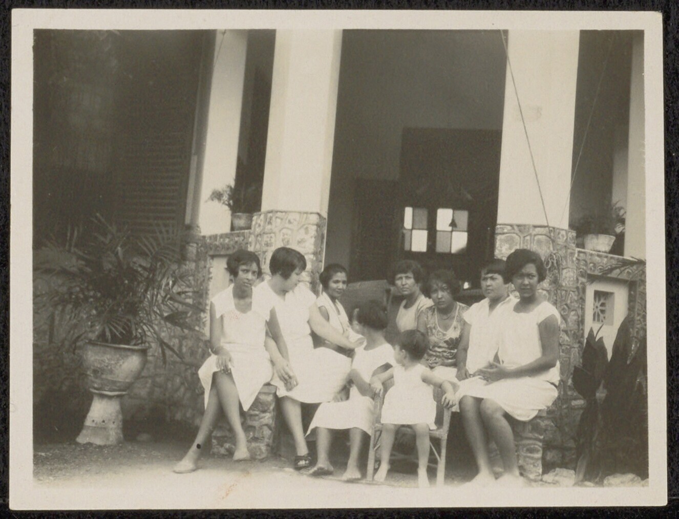 Groepsportret van vrouwen en kinderen, zittend voor ...