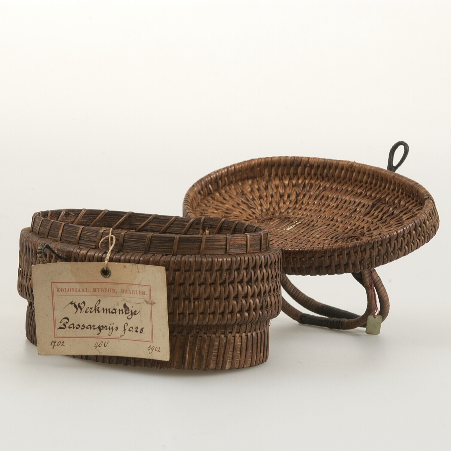 Gevlochten mand van bamboe op drie poten van hout