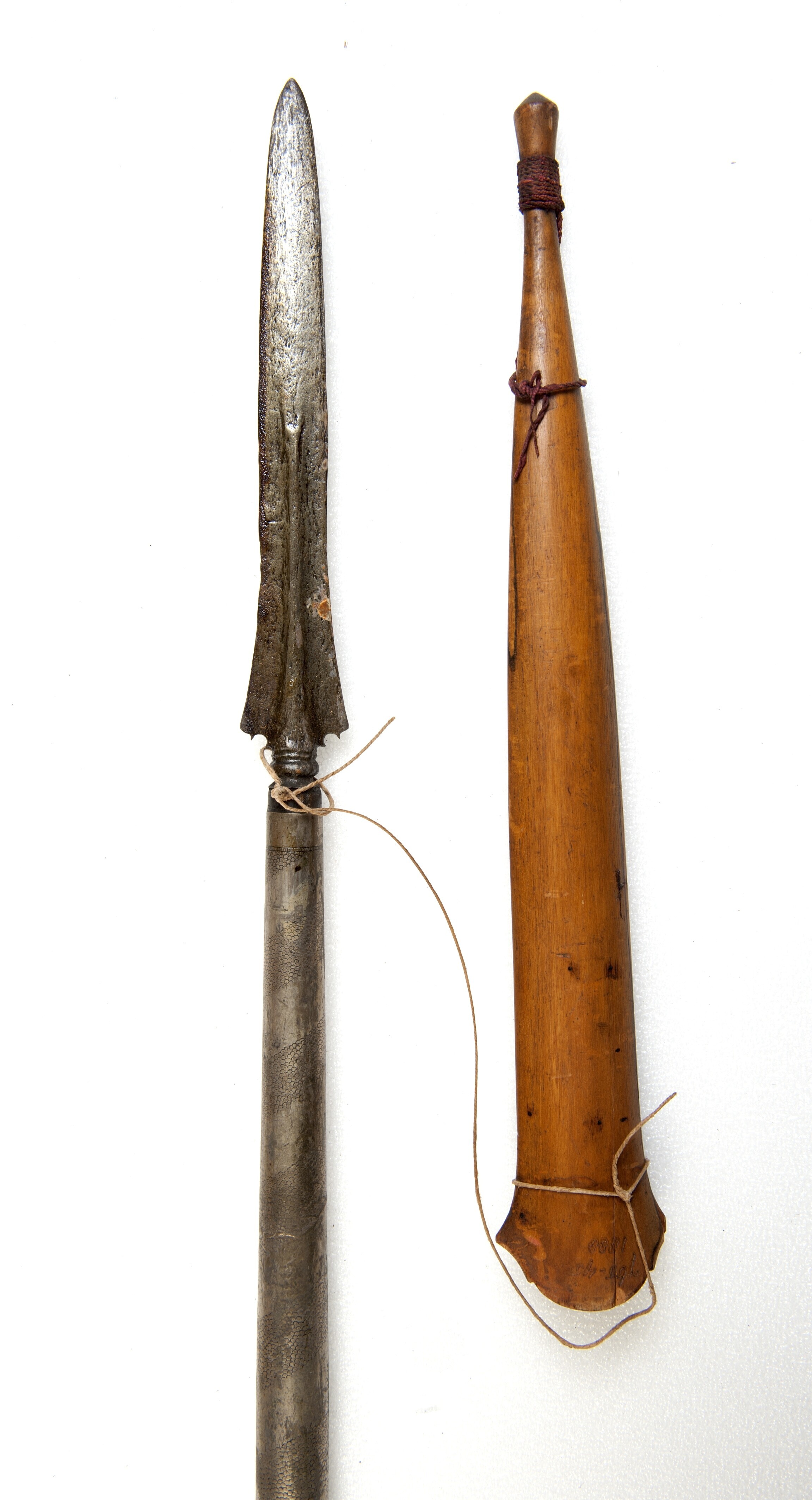 Houten lans voorzien van zwaardvormig lansblad met b...