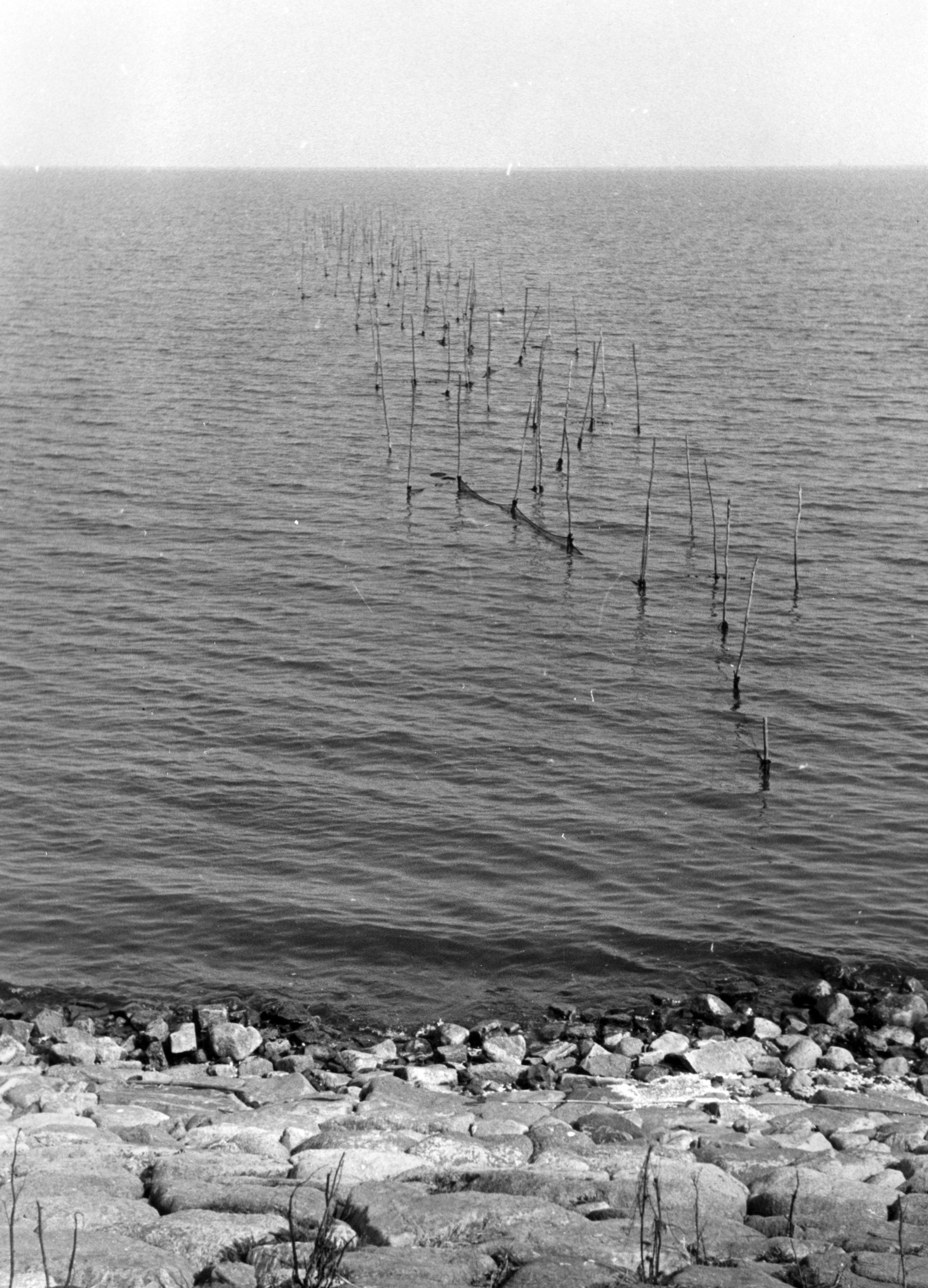 Palingfuiken in het IJsselmeer, 1942 (zwart-wit foto)