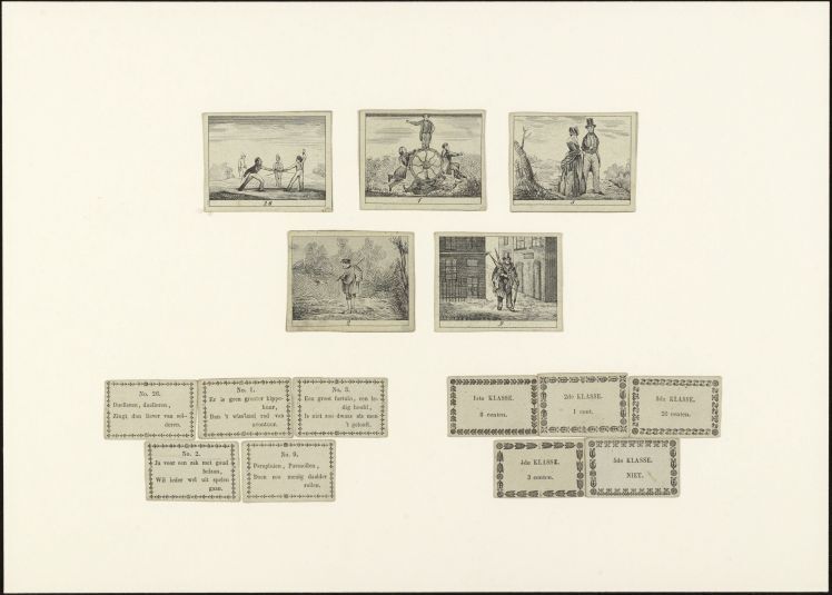Blakje met vier fichesdozen waarop voorstellingen va...