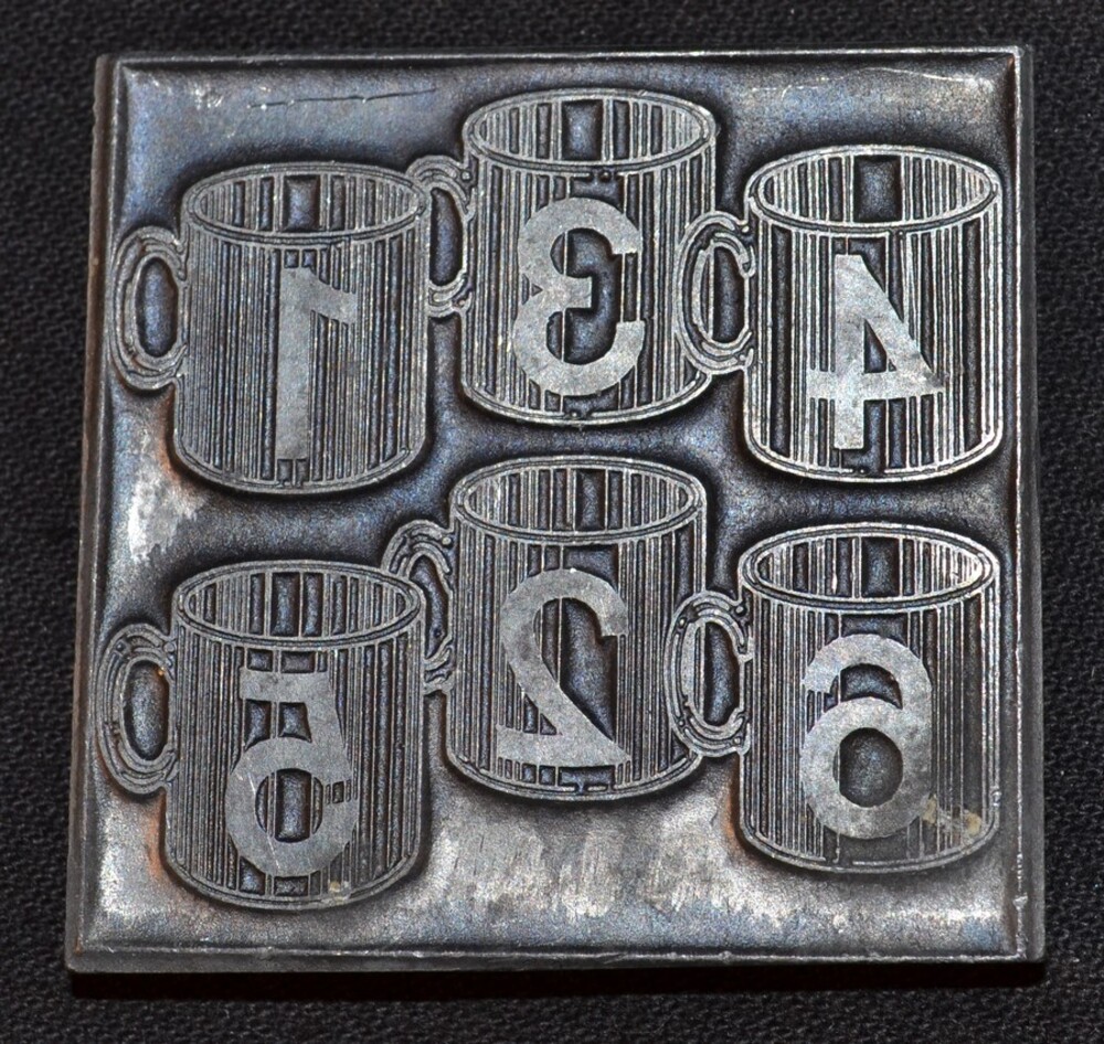 Cliché van lood afbeelding 6 mokken of pullen met de...