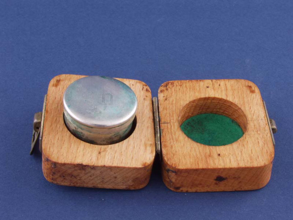 Doosje van hout met daarin een potje van zilver met ...