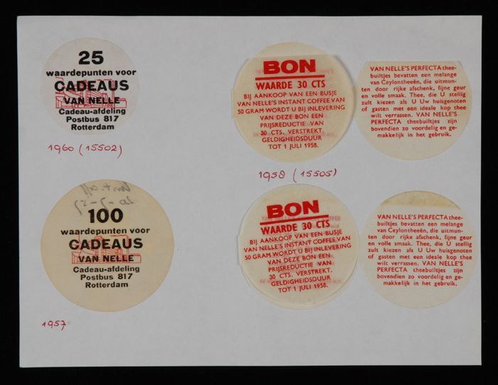 Vel papier met twaalf bonnen voor Van Nelle's "CADEAUX"