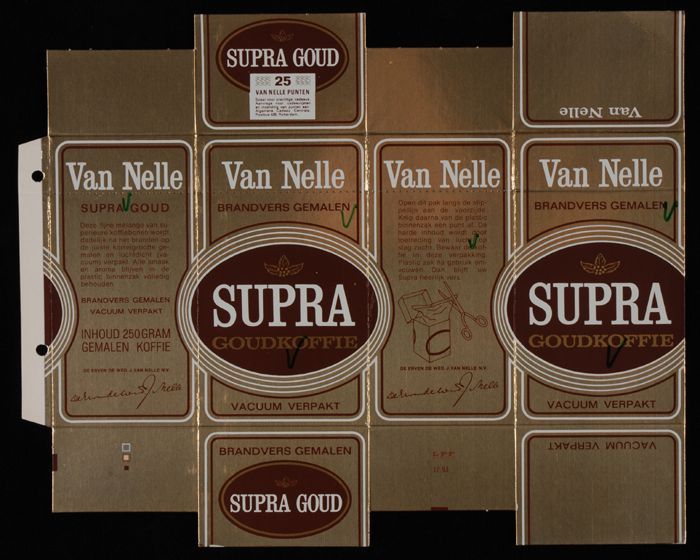 Ongevouwen doos Van Nelle's "SUPRA" goudkoffie, vacu...