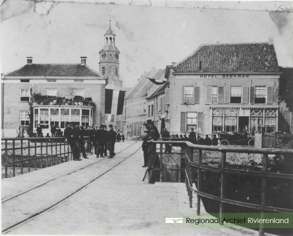 Stadsgezicht met brug en rechts hotel Beekman.