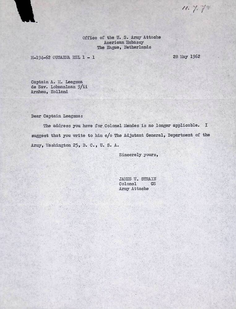 U.S. Army Attache American Embassy, Den Haag Nederland.