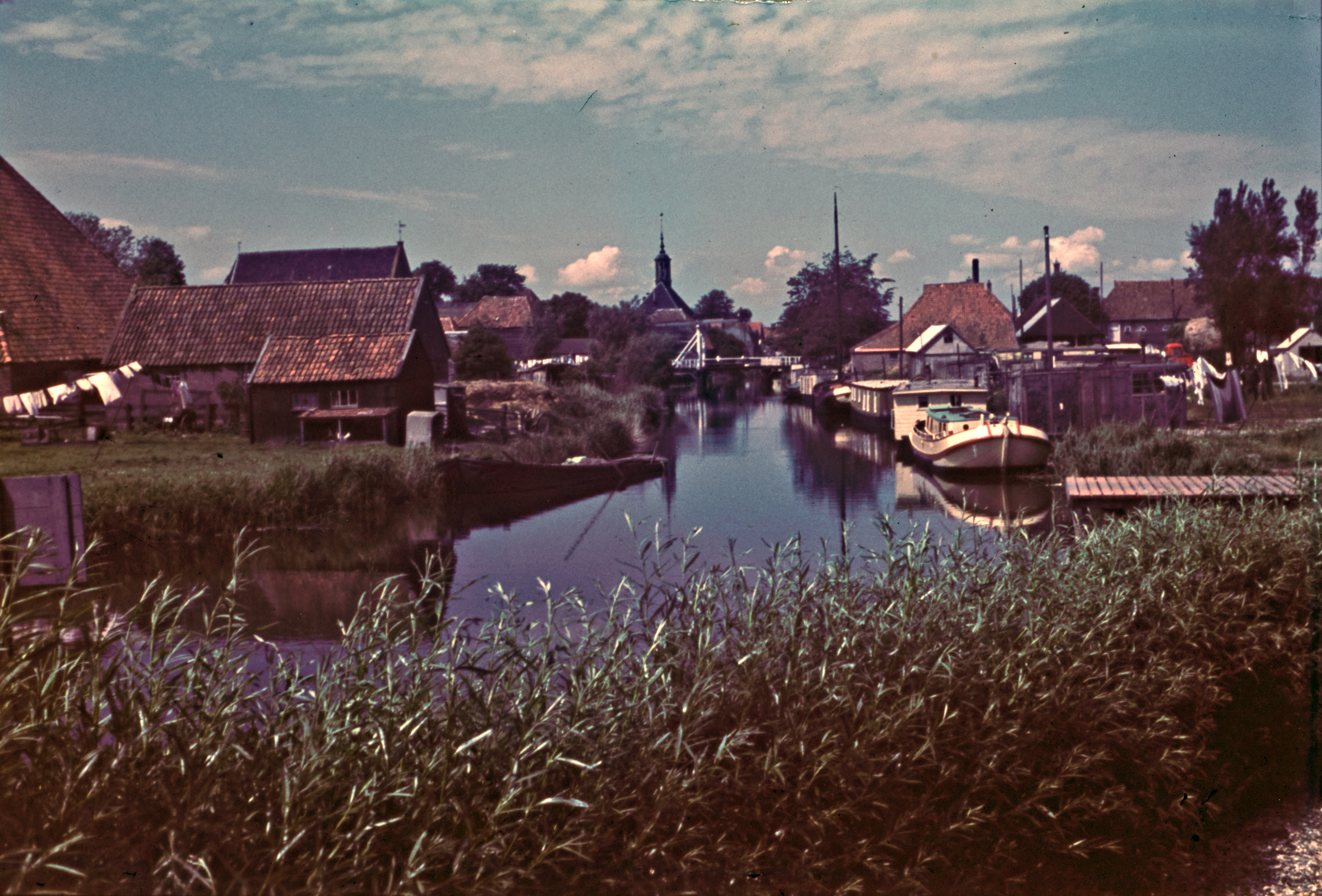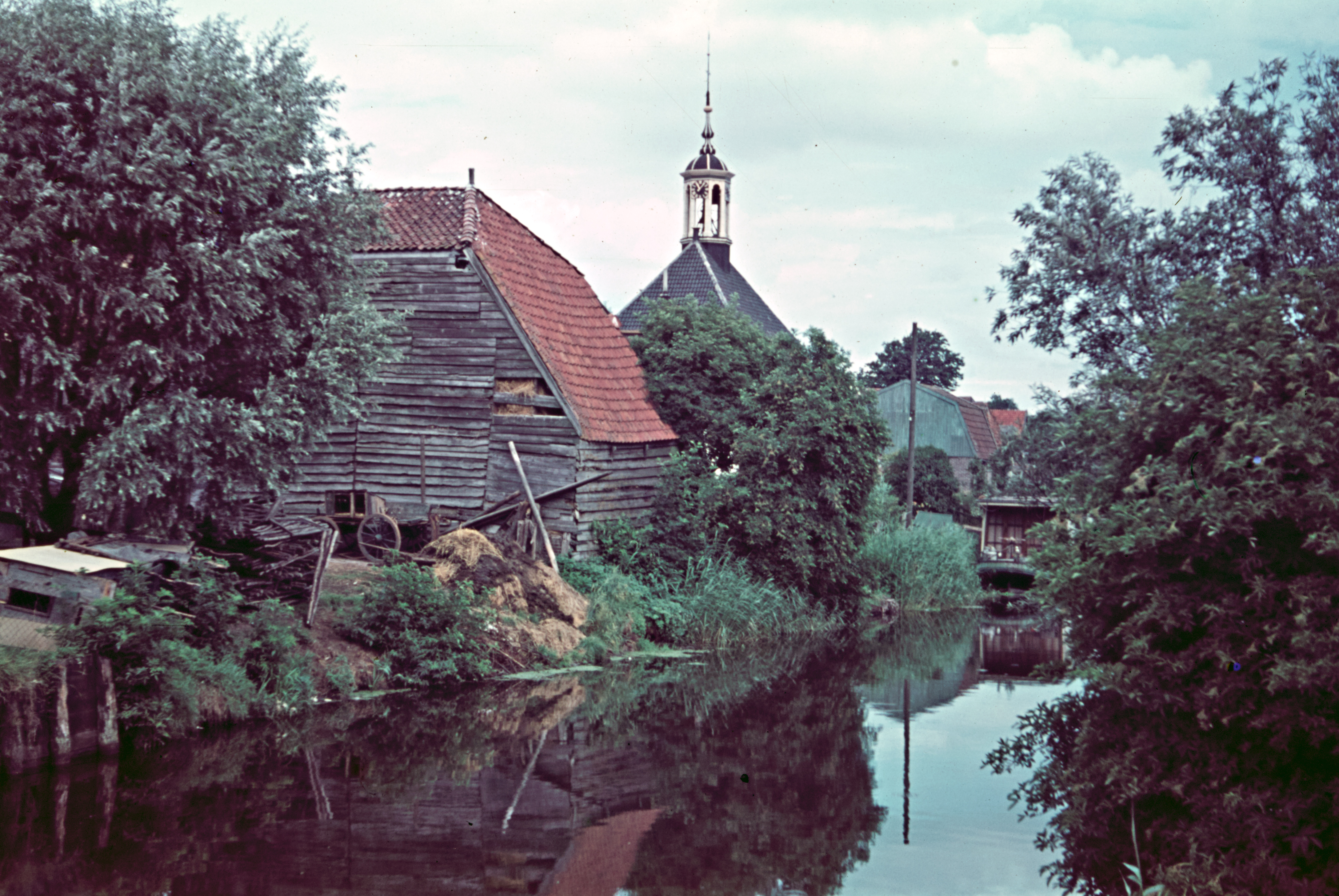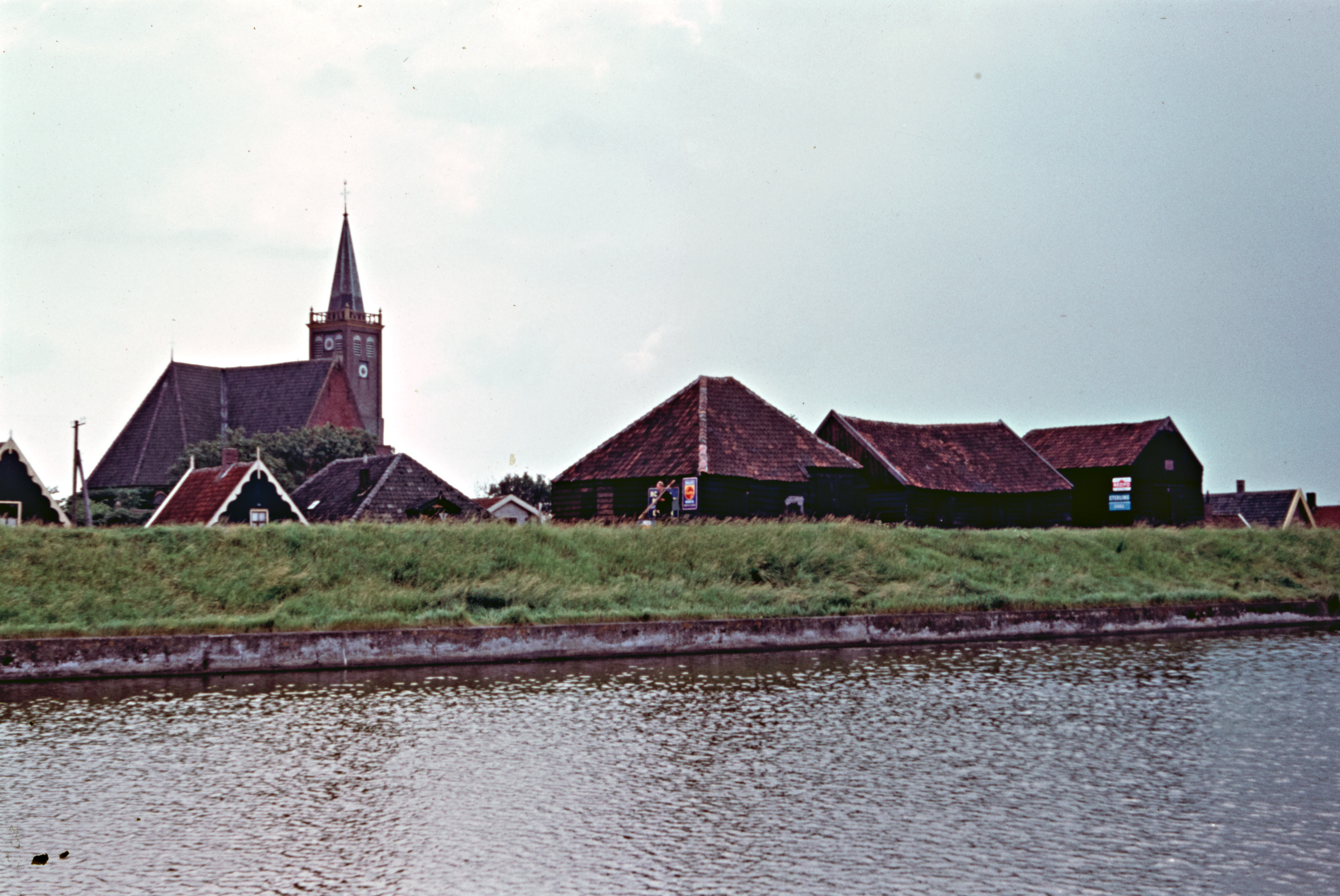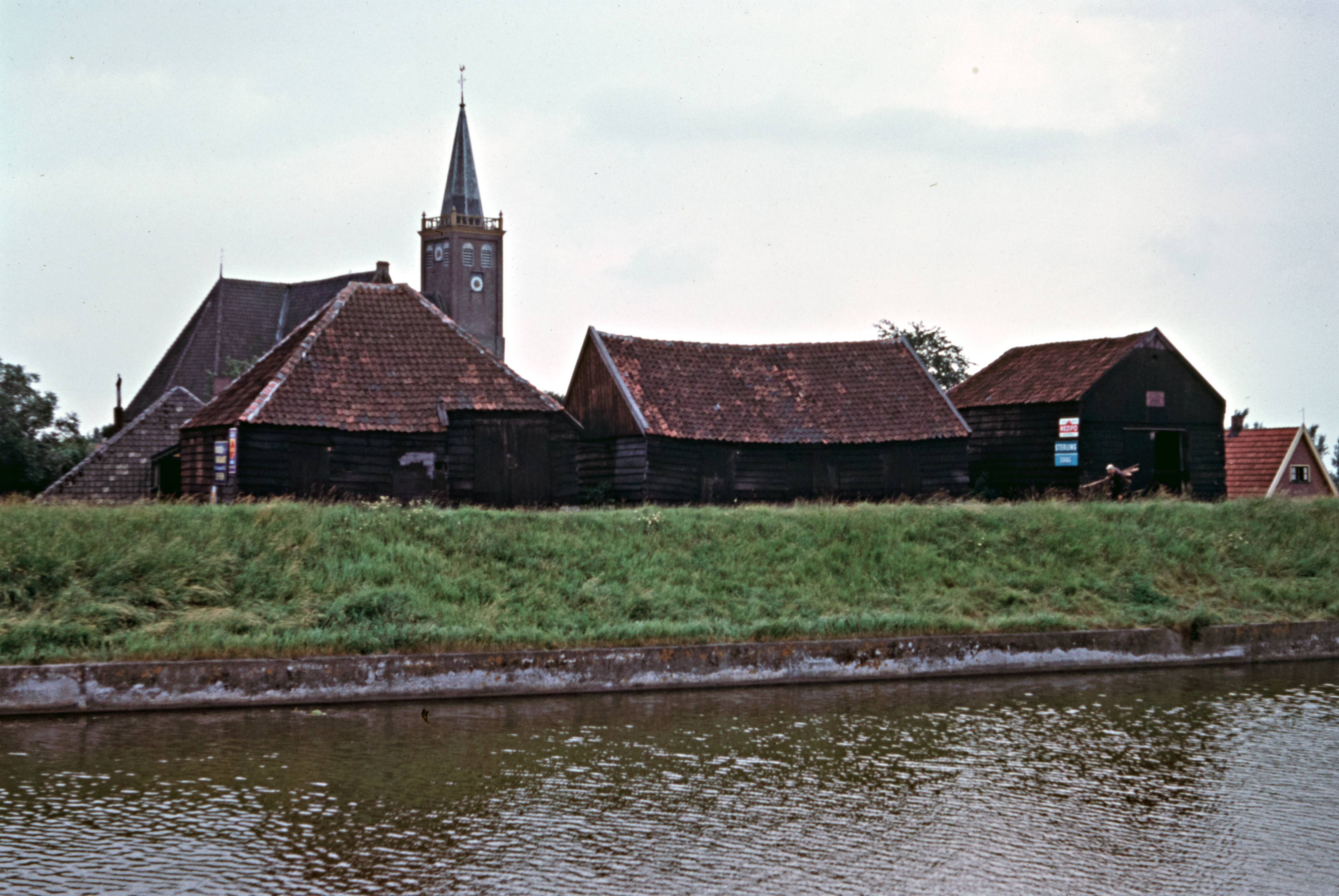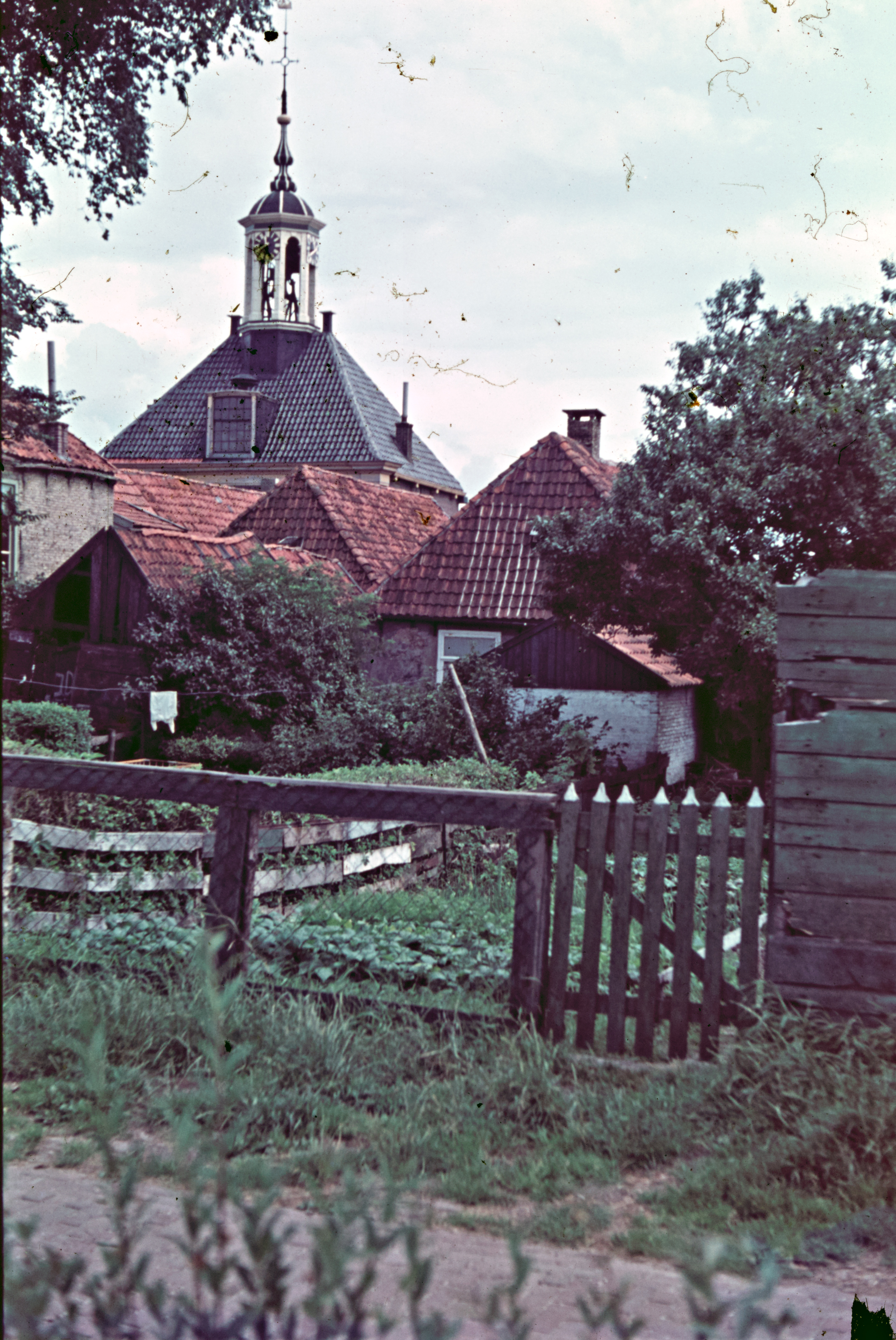 Kuinre gezien vanaf een boerenerf, raadhuis in de verte