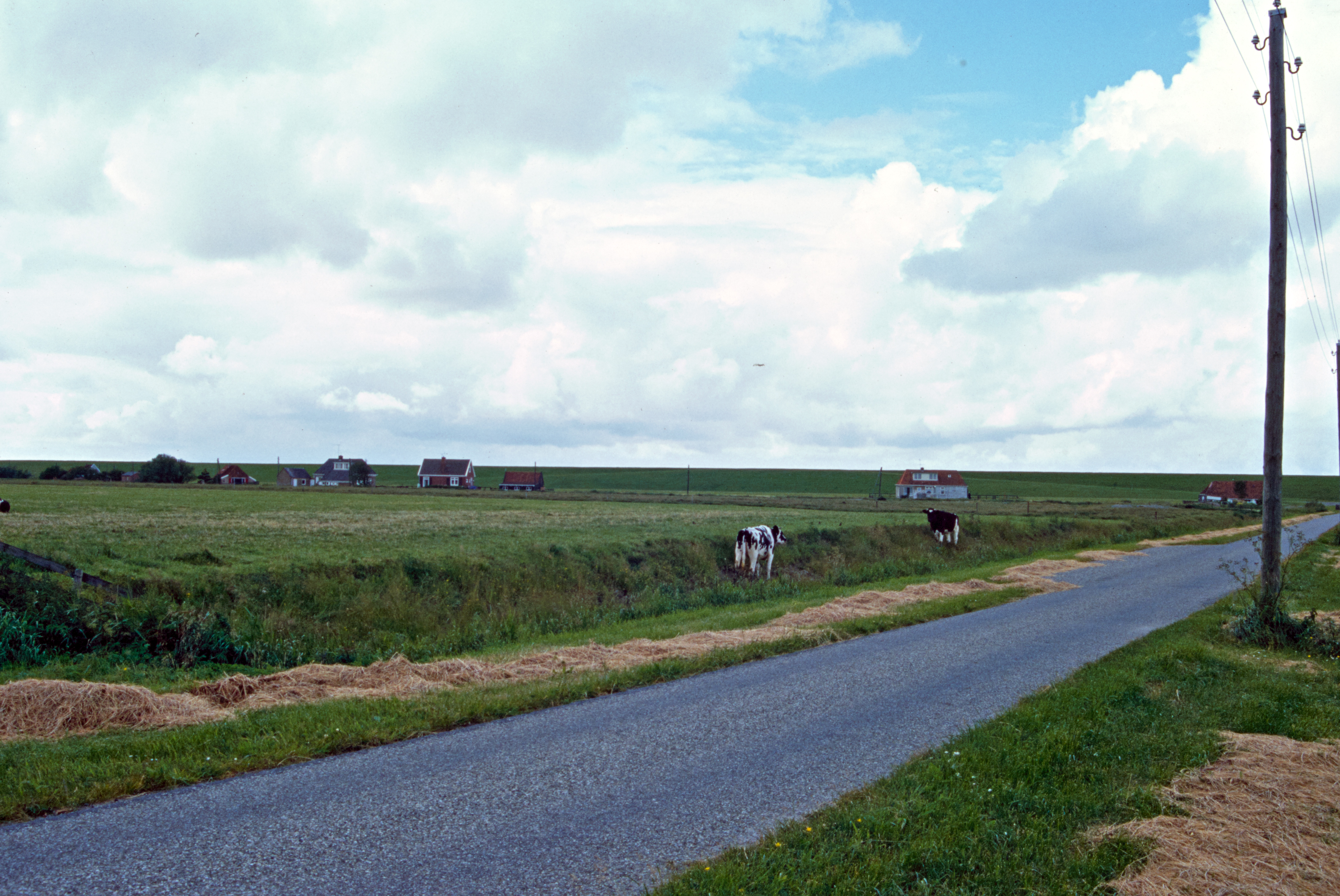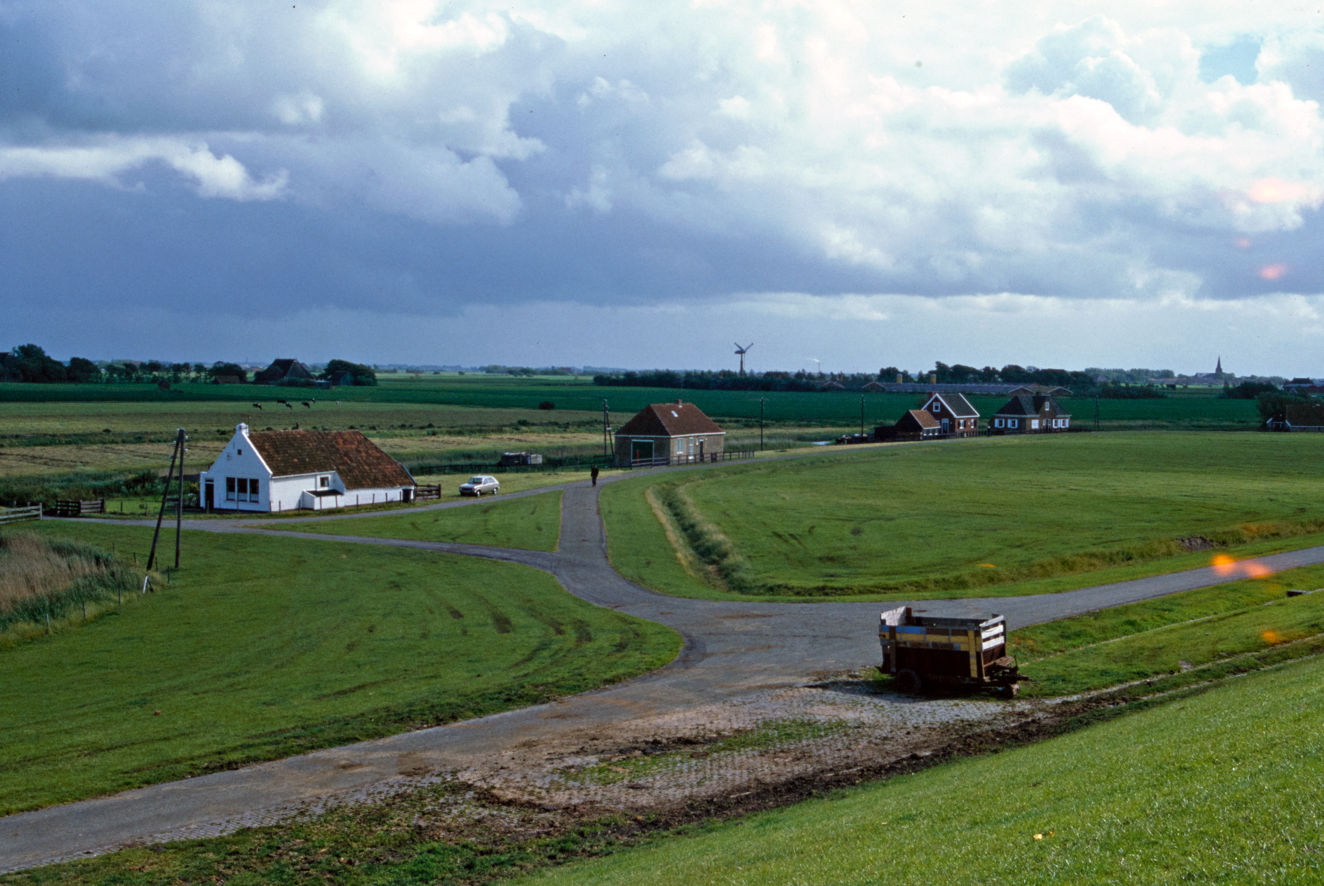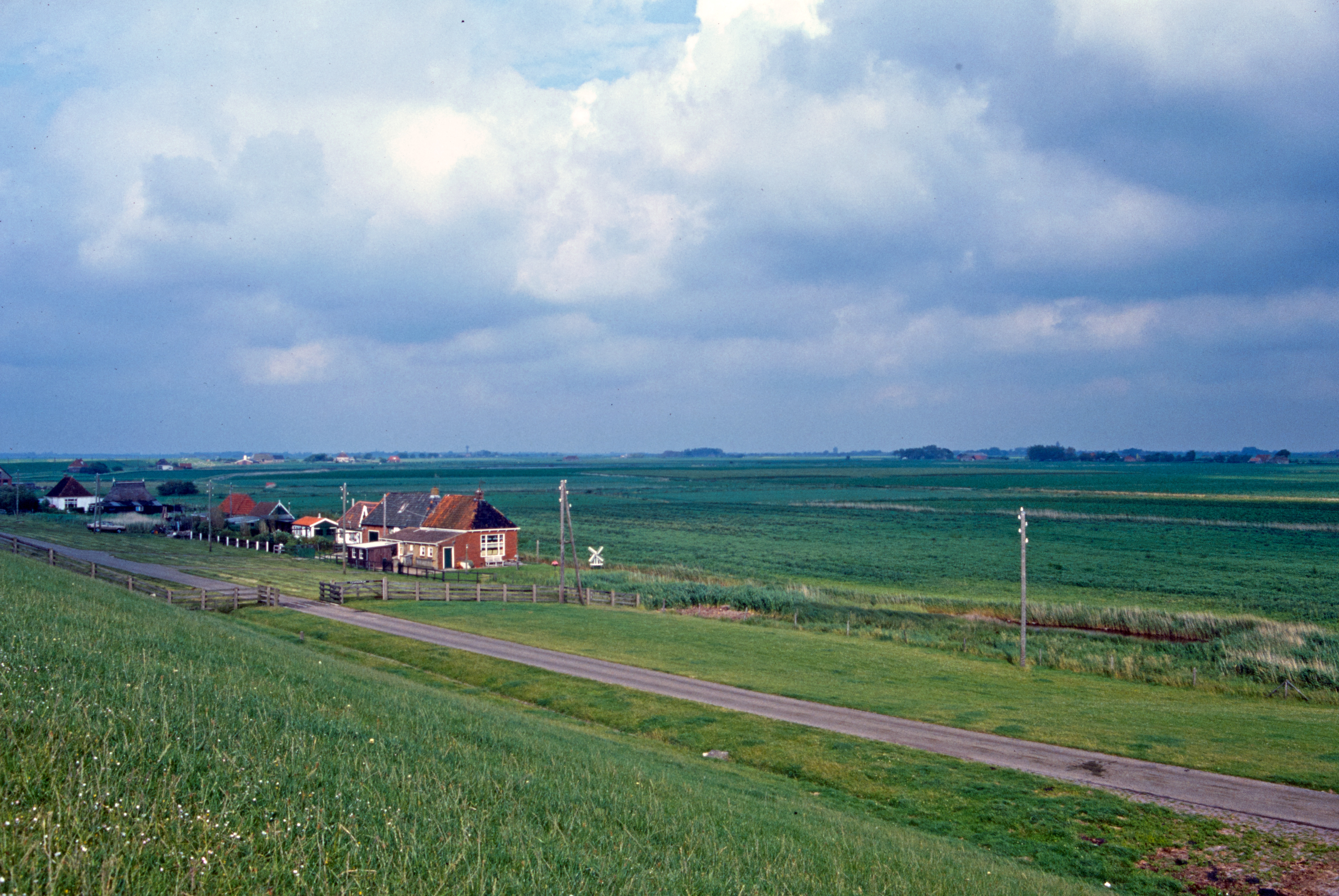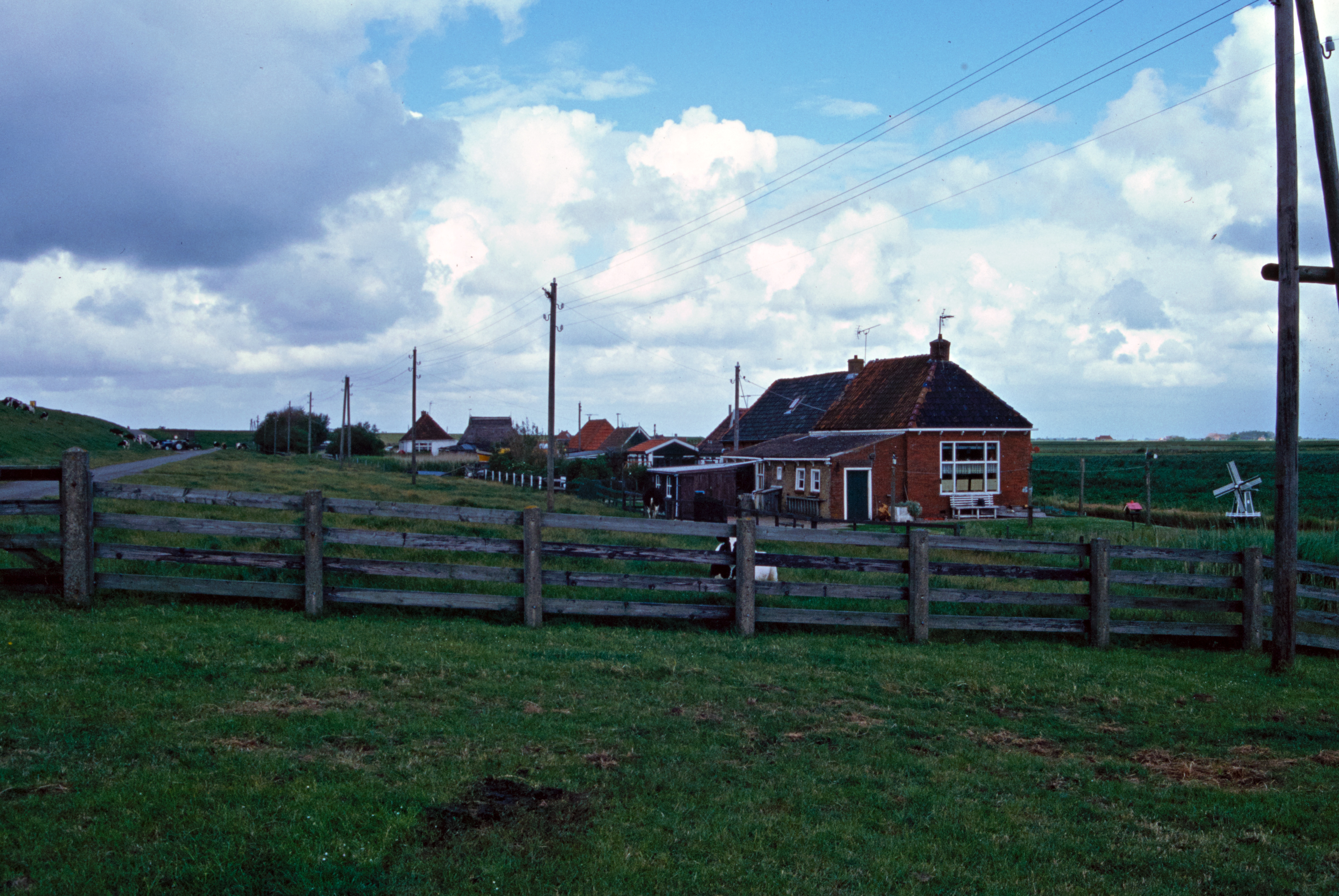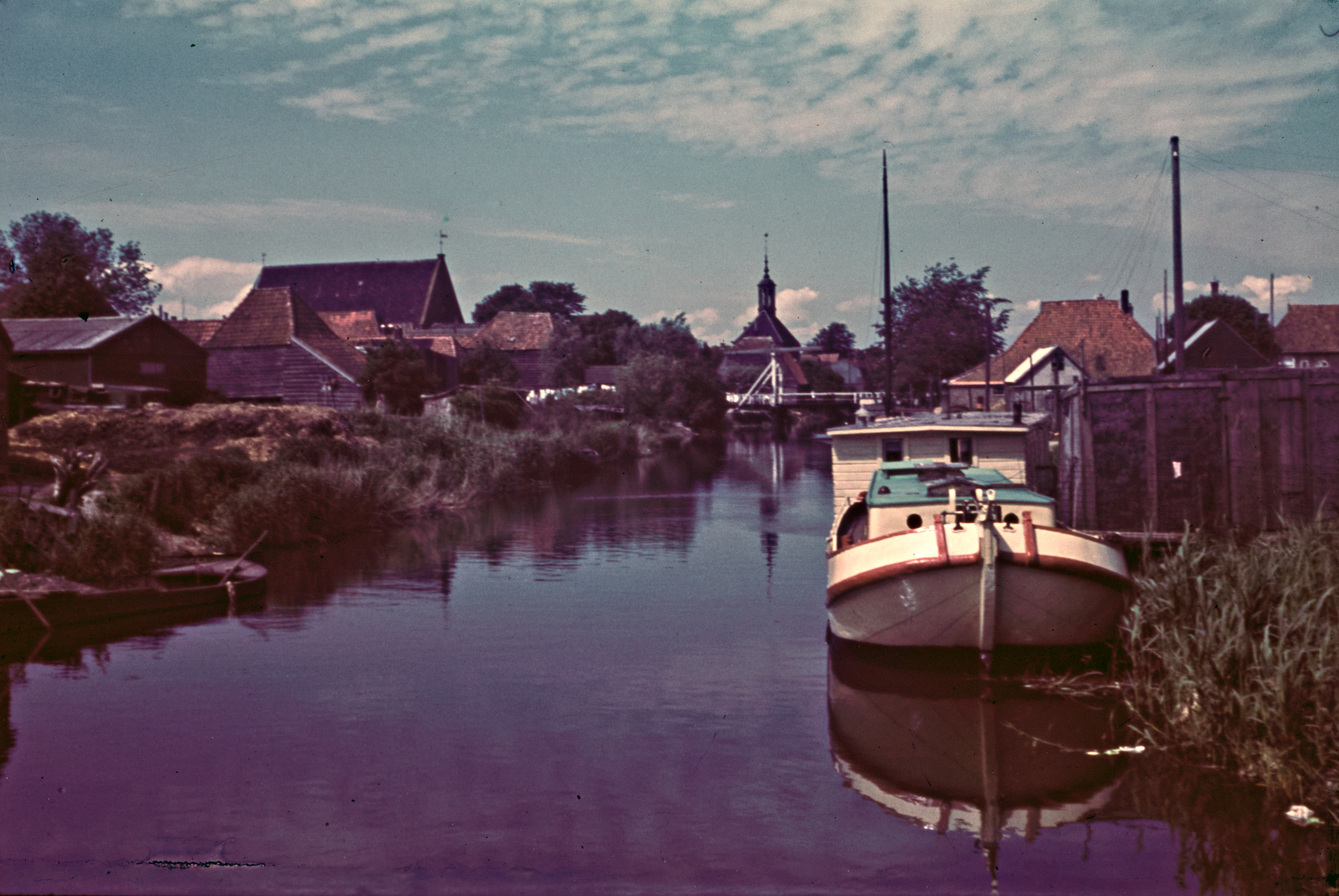 Kuinre gezien vanaf een boerenerf, raadhuis in de verte