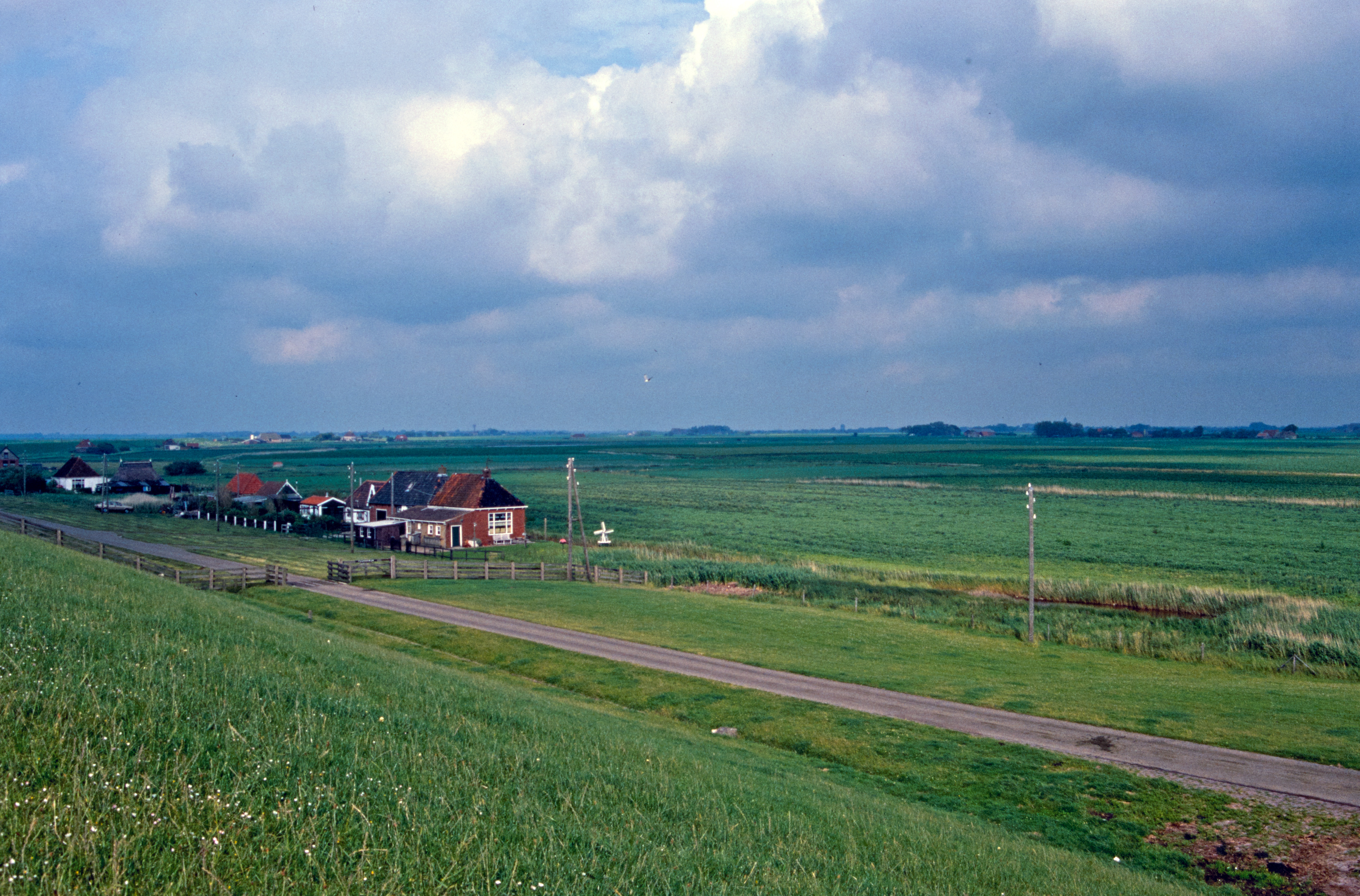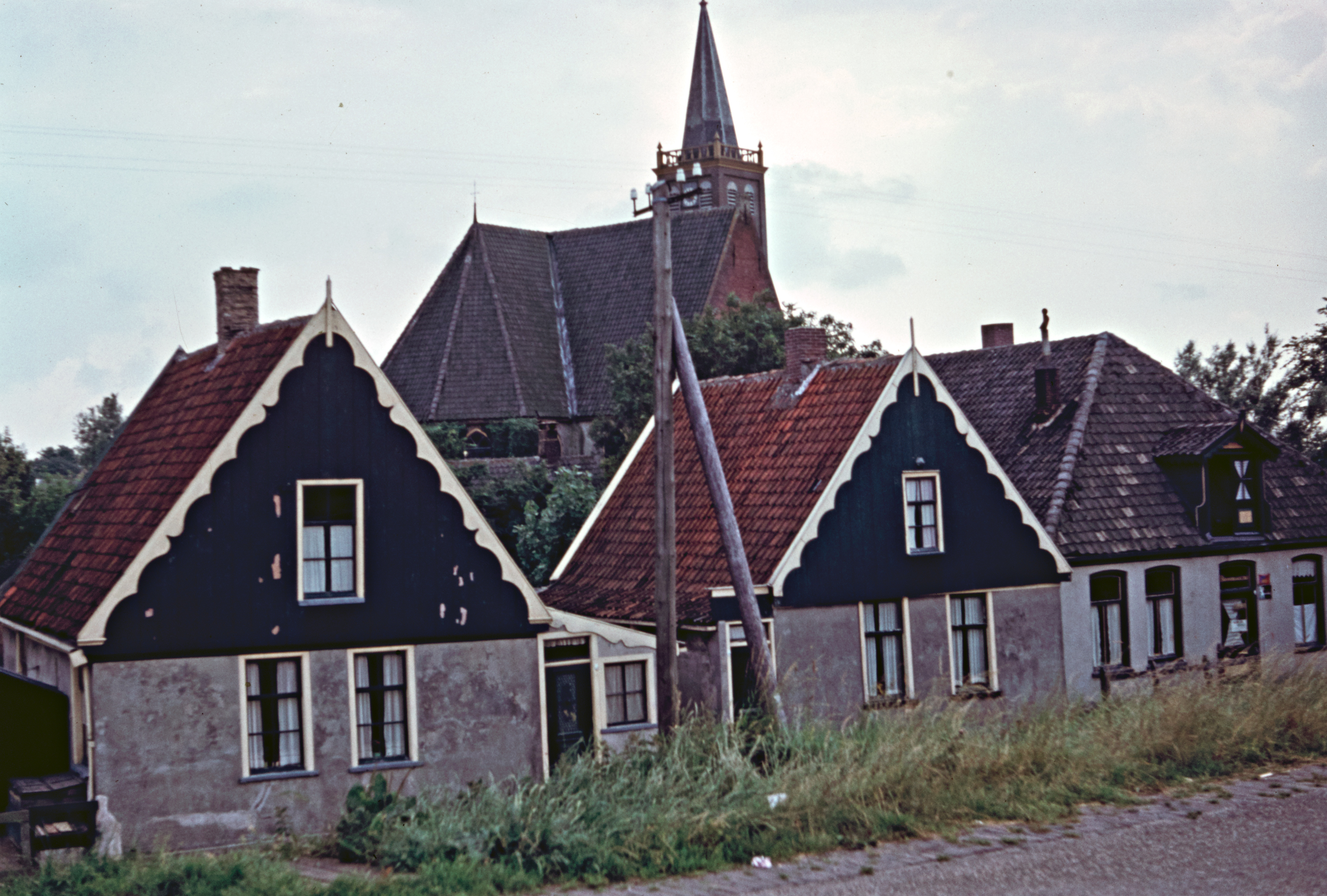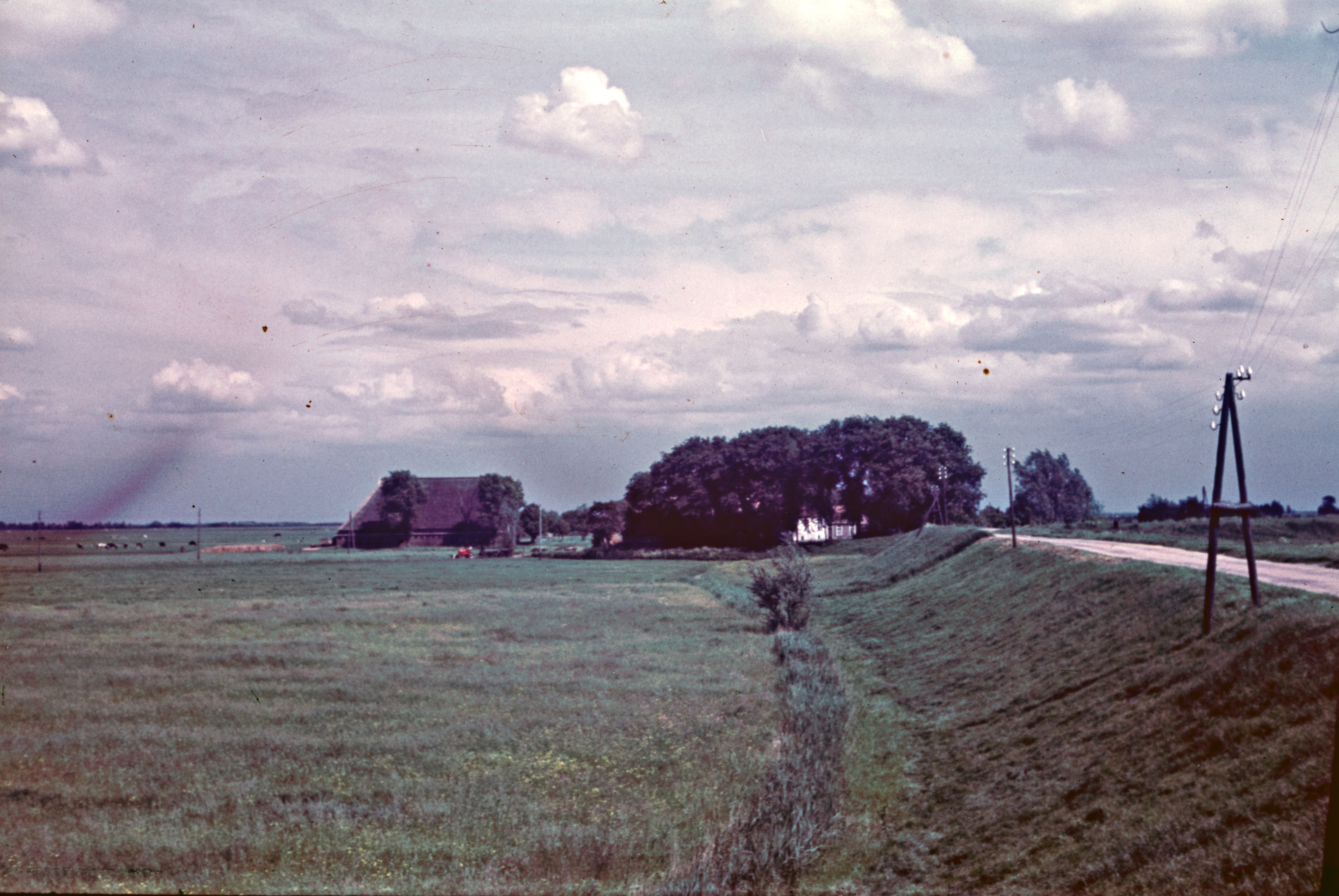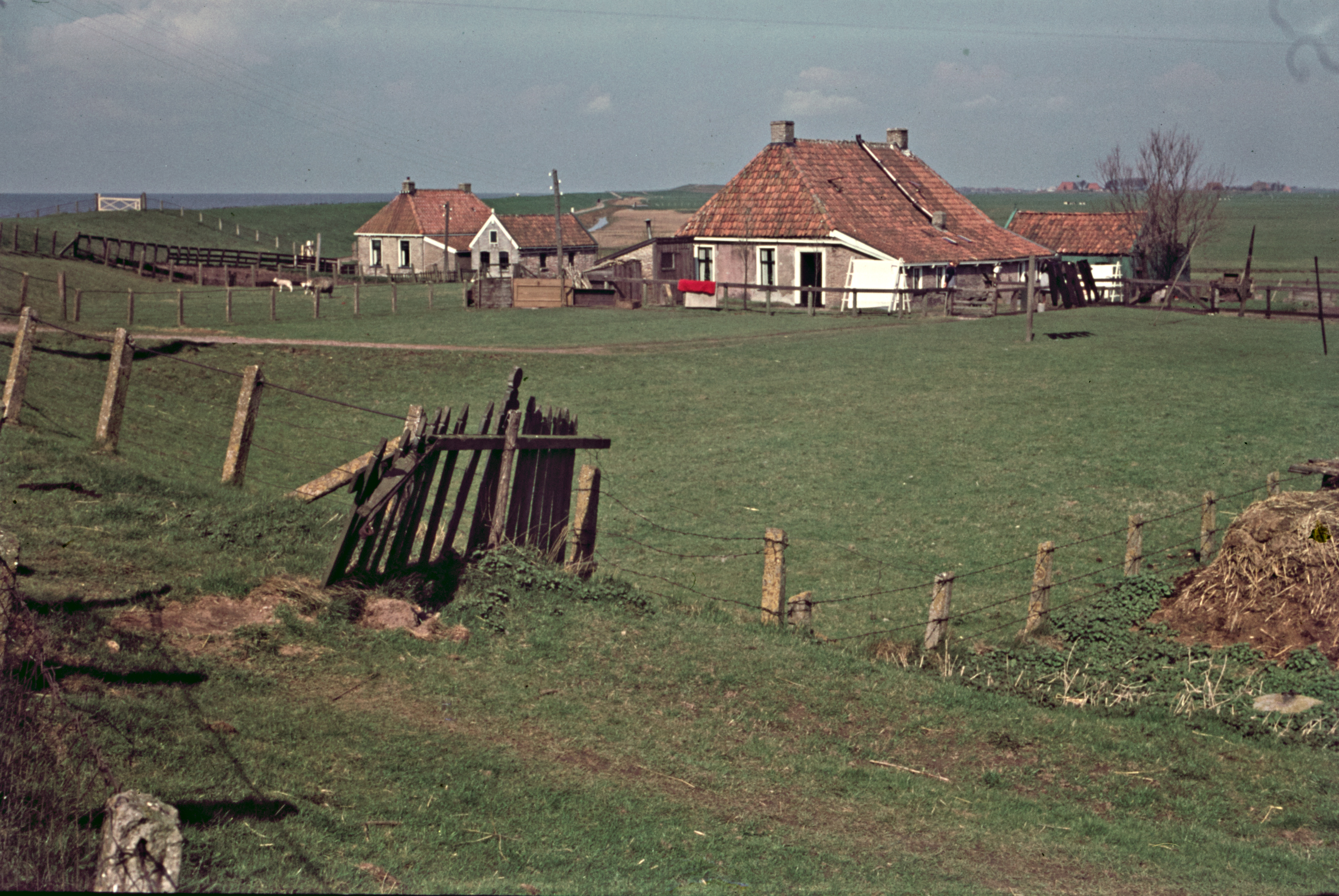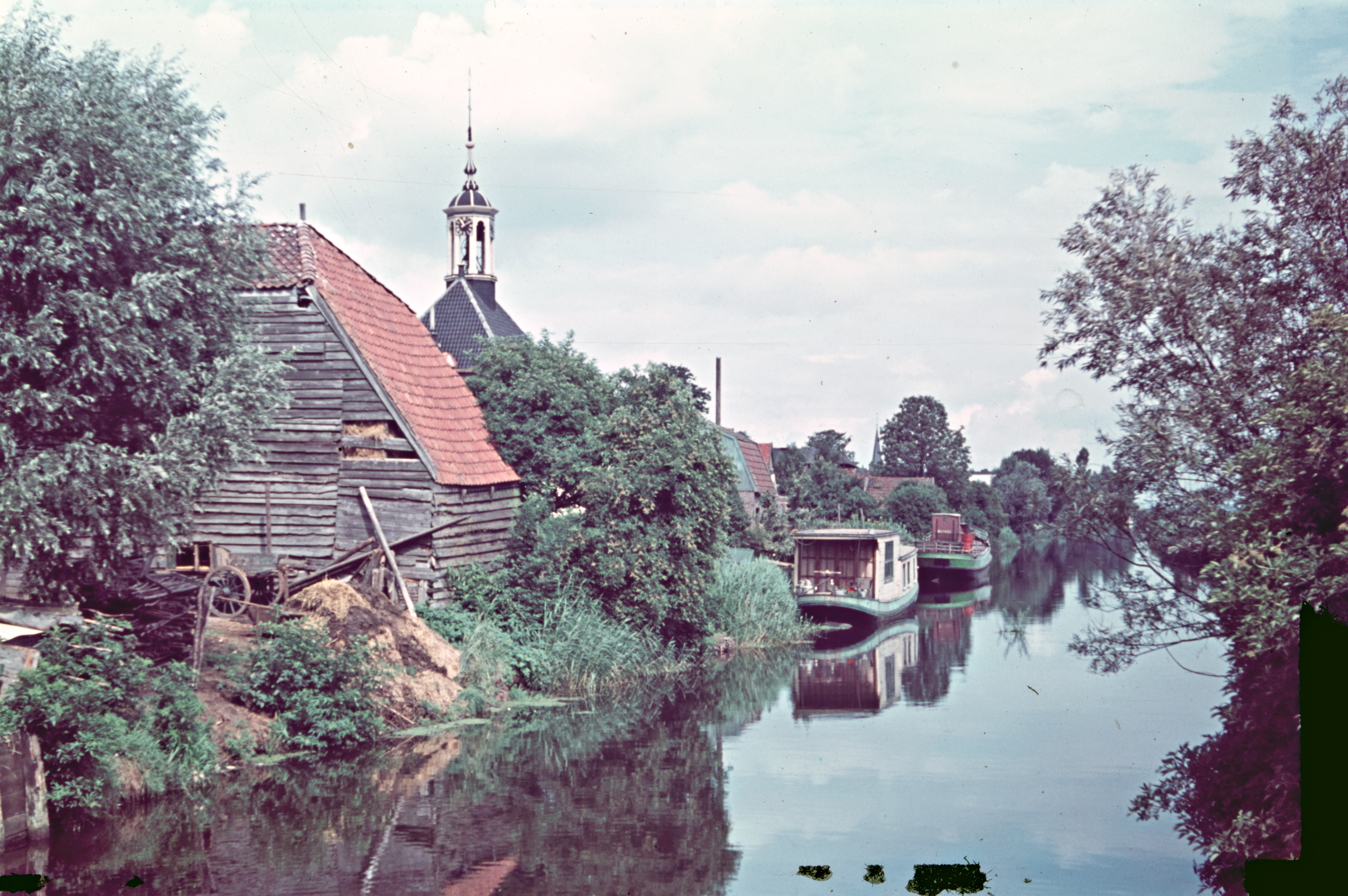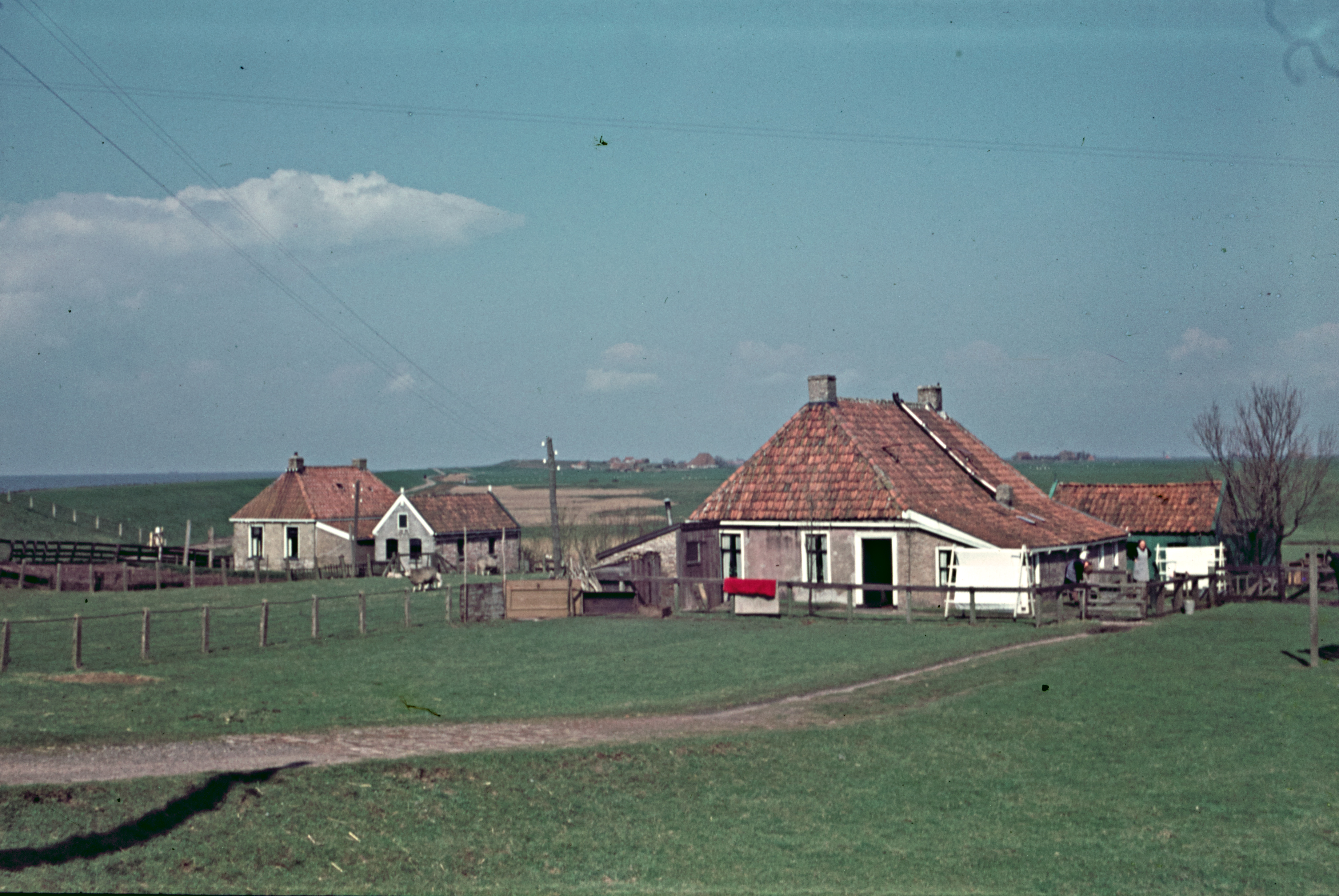 Kuinre gezien vanaf een boerenerf, raadhuis in de verte