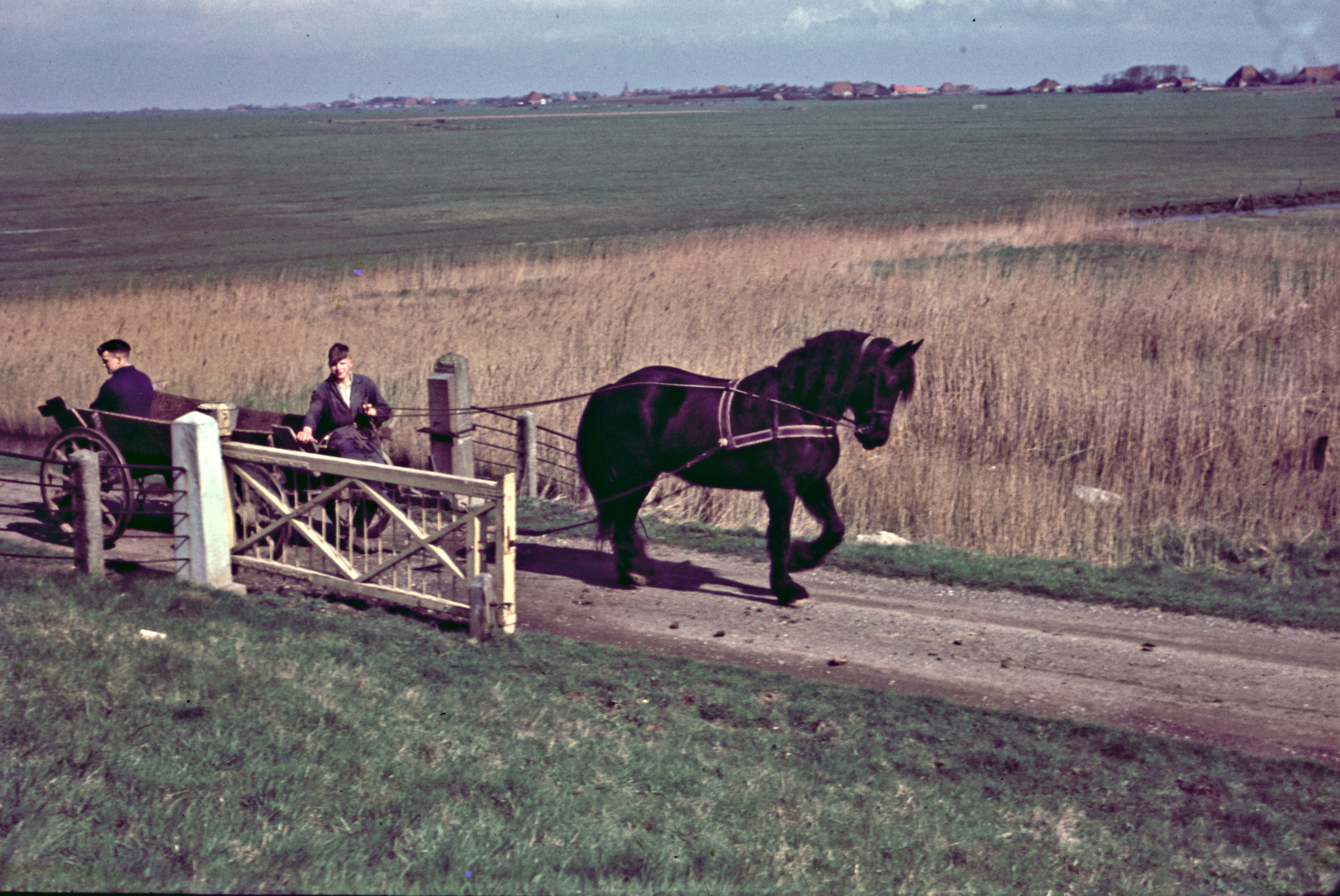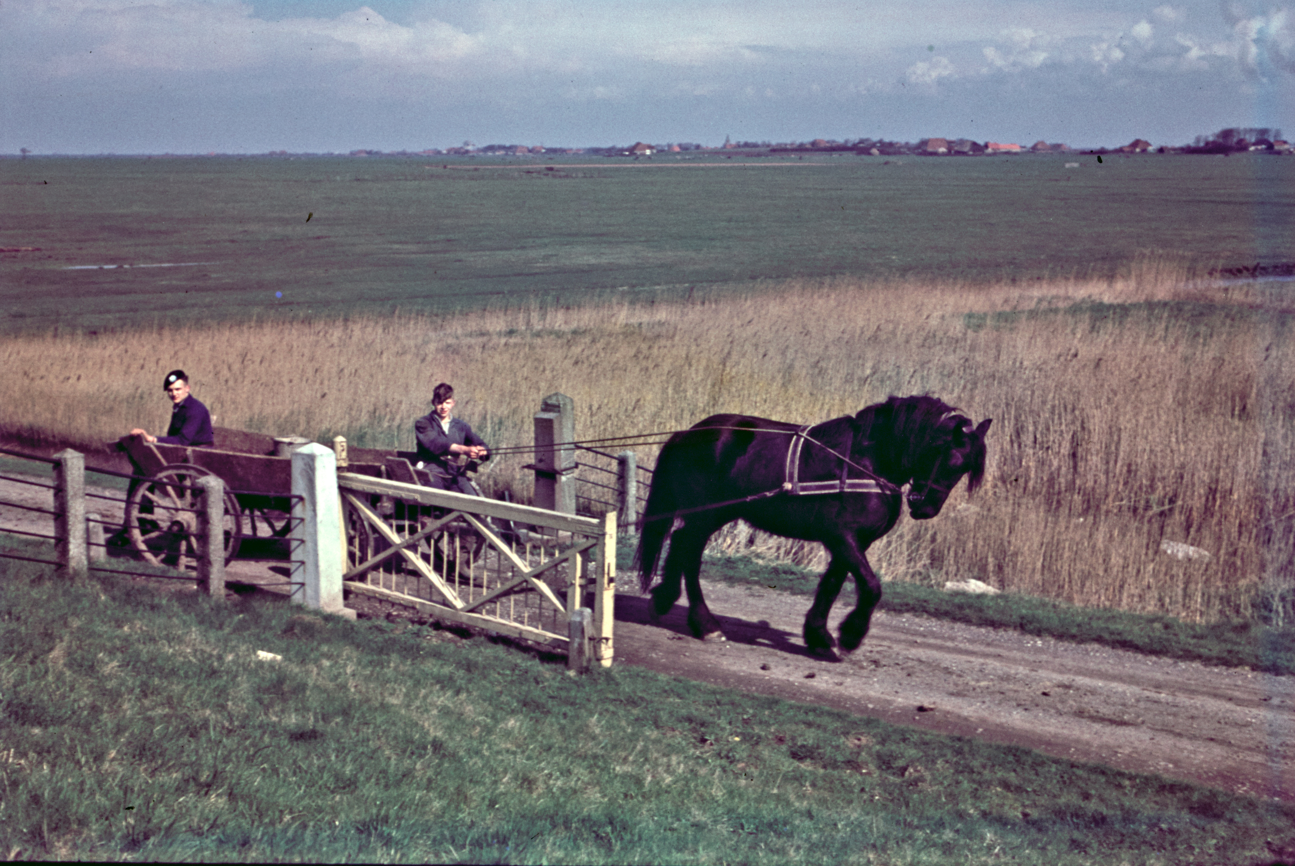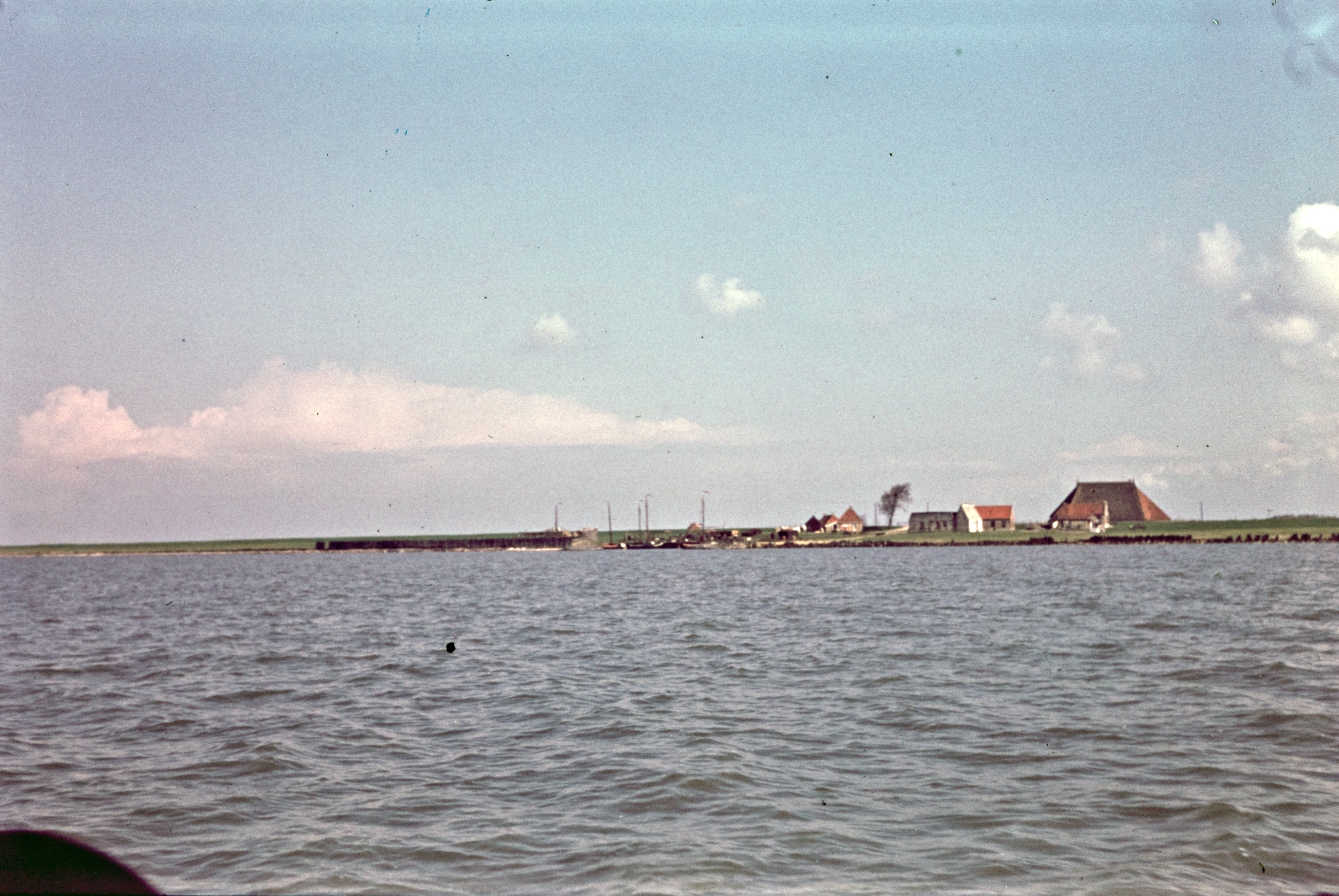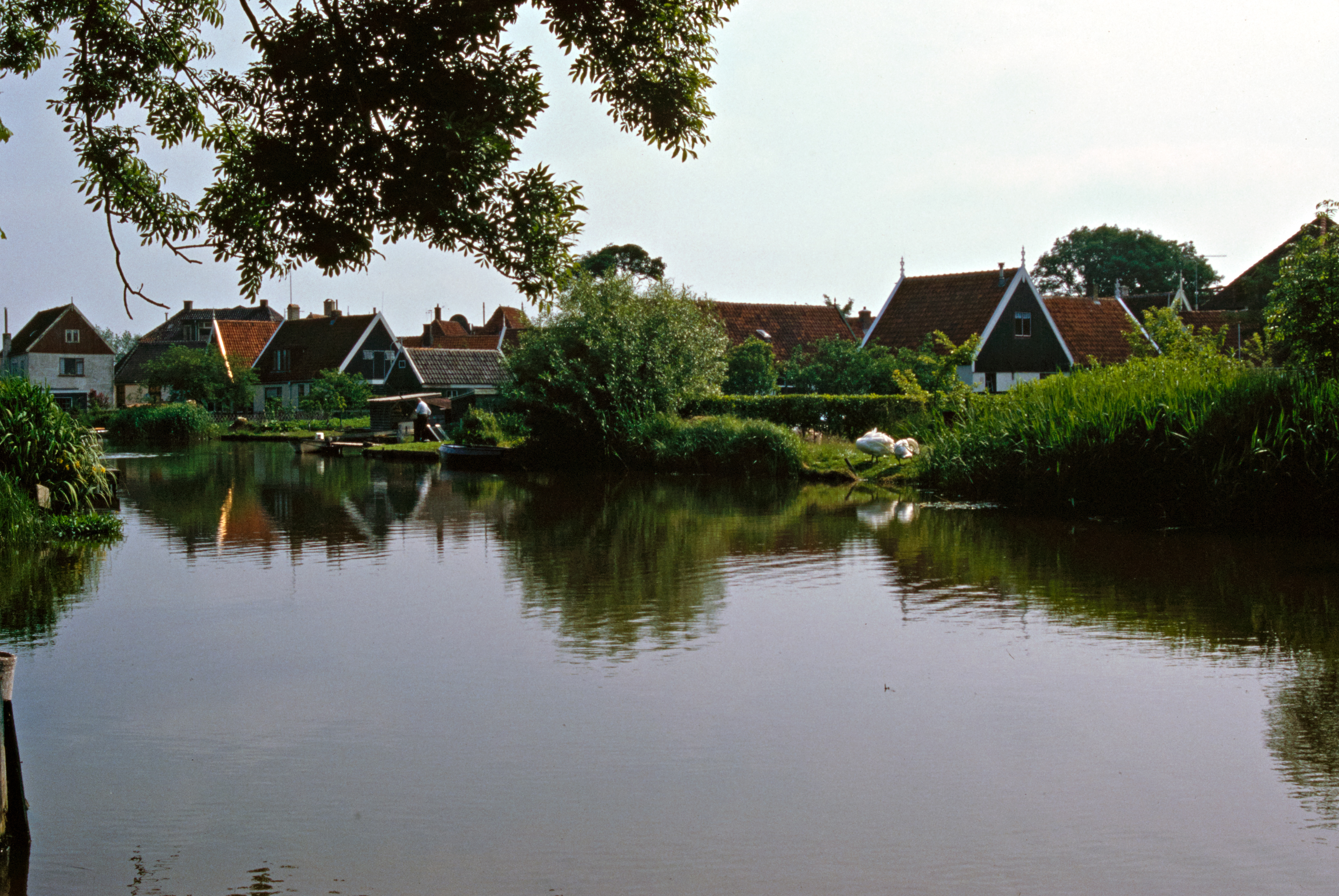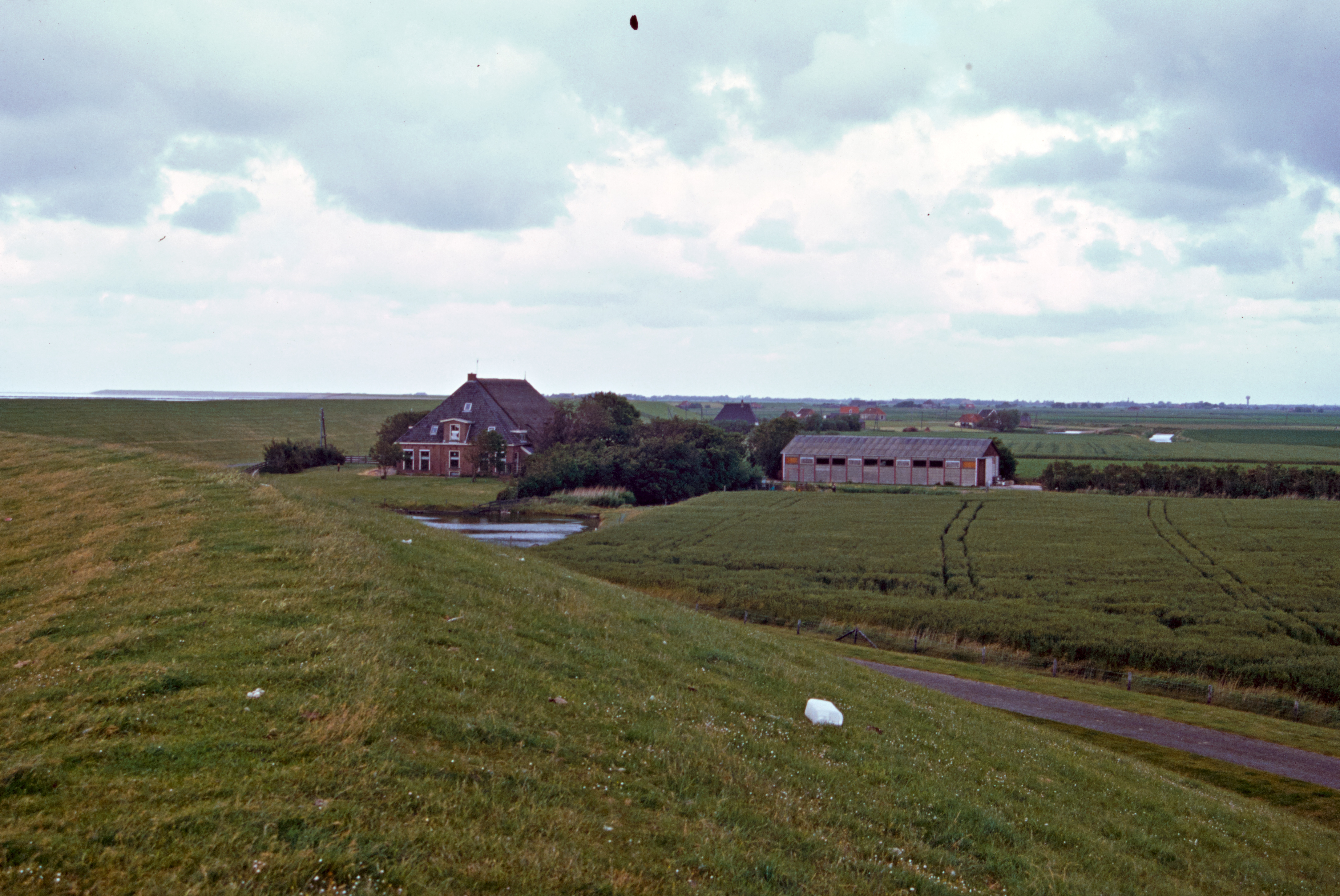 Kuinre gezien vanaf een boerenerf, raadhuis in de verte