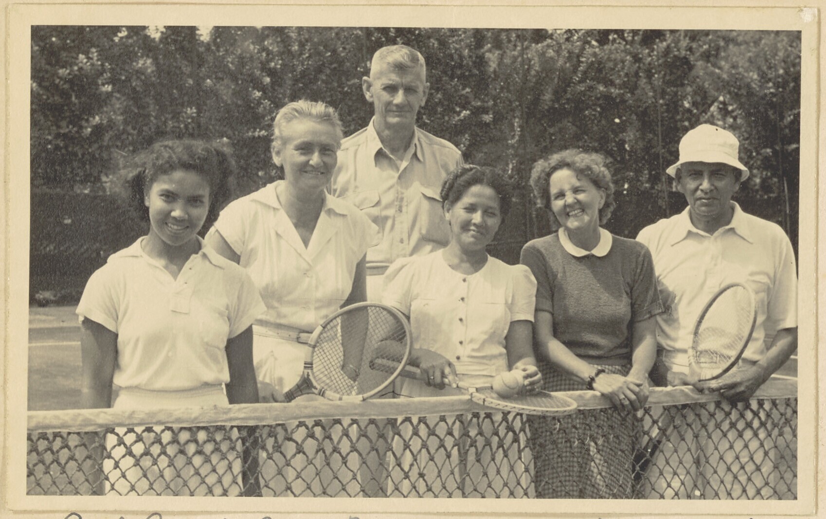 Mannen en vrouwen op de baan van de Bandungse tennis...