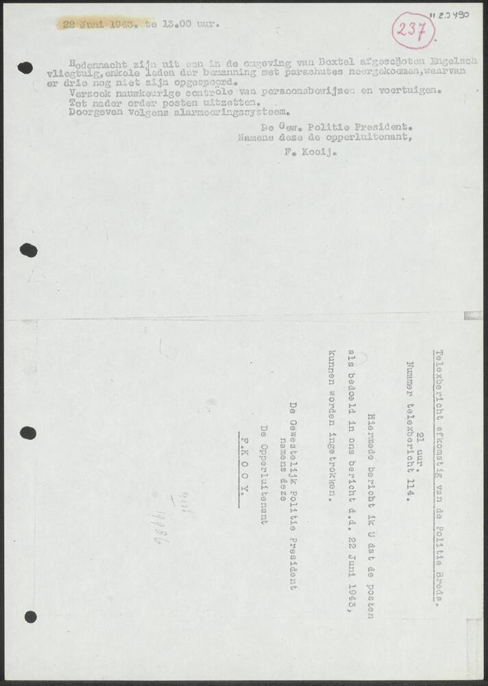 Telexberichten Politie Breda 22 juni 1943.