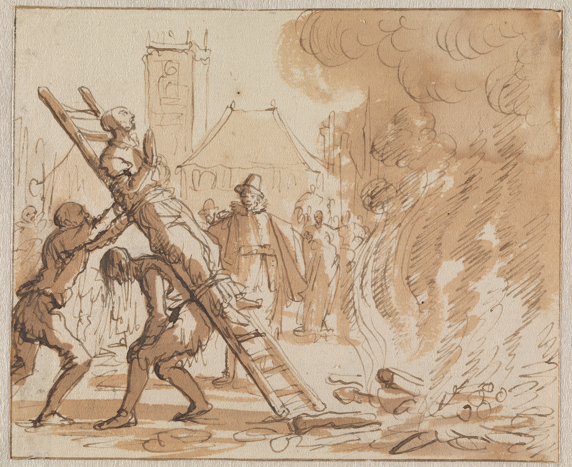 Pieter Bekjen beklimt de brandstapel in Amsterdam in...