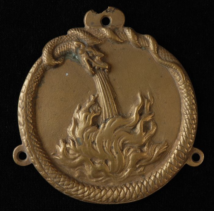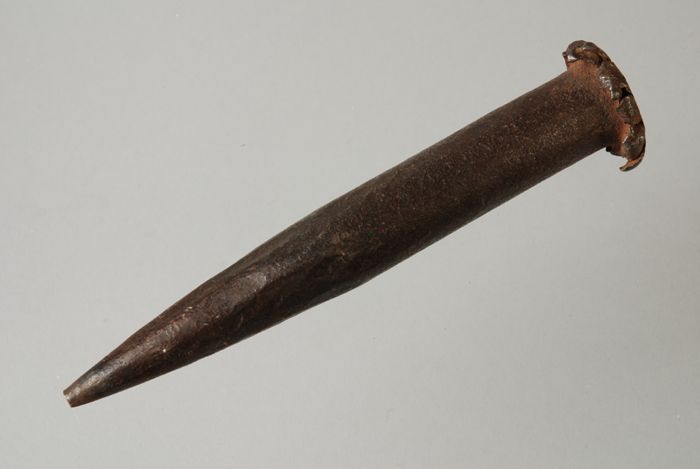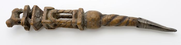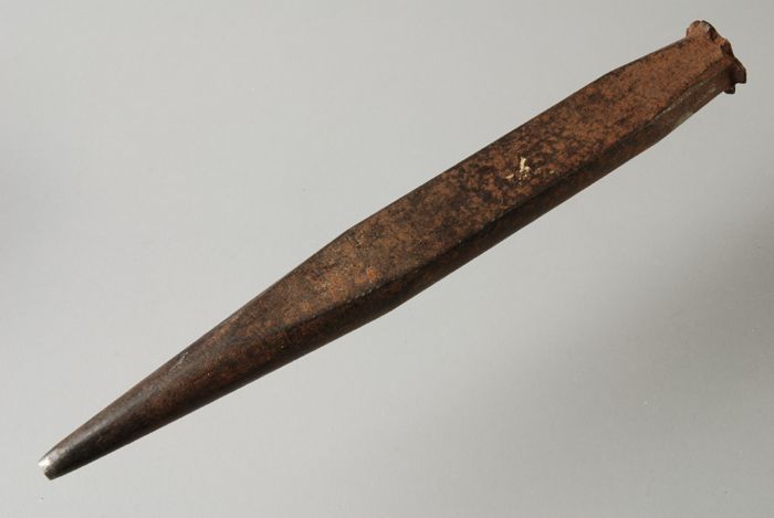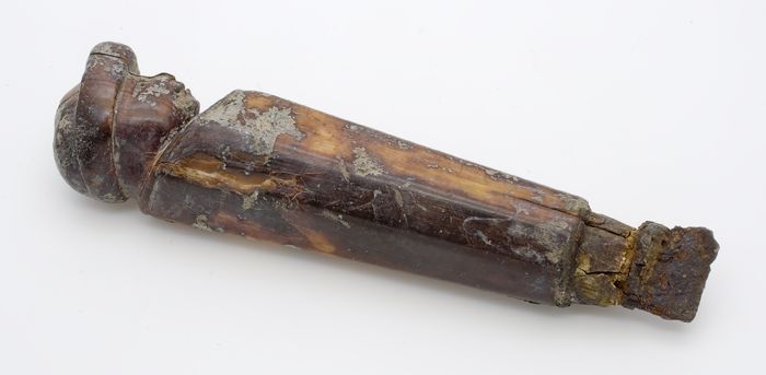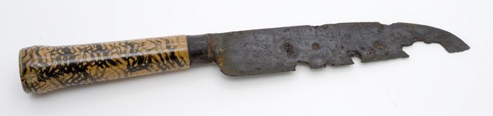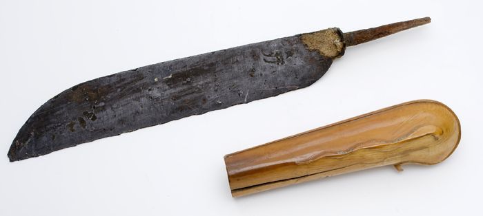 Gedateerd mes met gegraveerd lemmet en gevlamd benen...