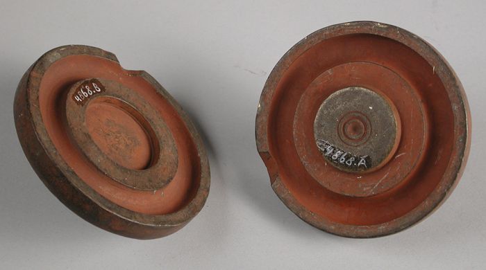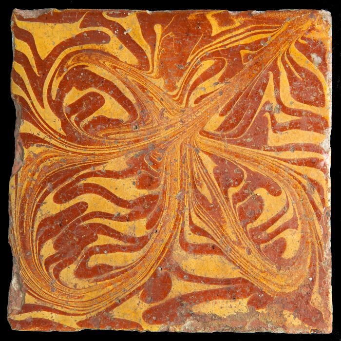 Plavuis, rood aardewerk, decor in slibvloeitechniek