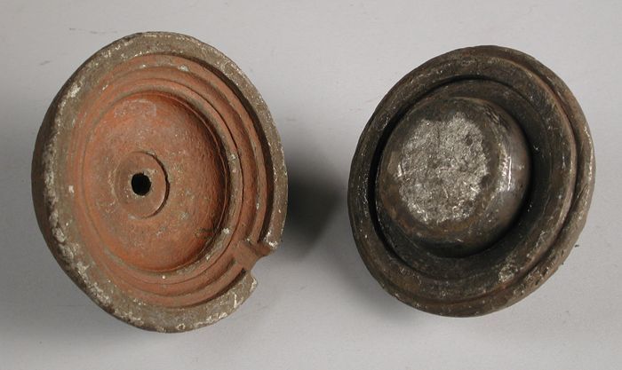 Groene plavuis, rood aardewerk, rond gat in het midden