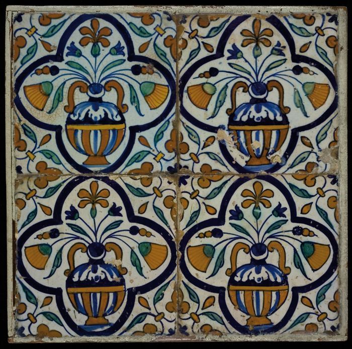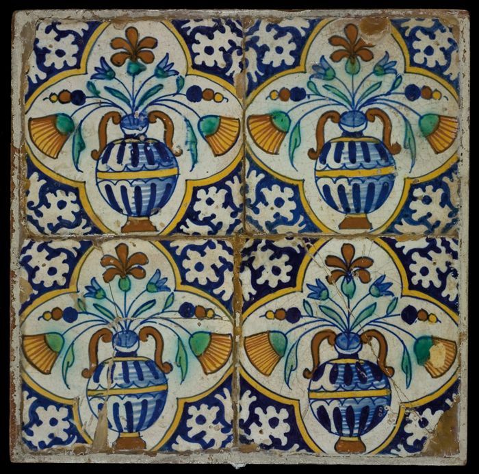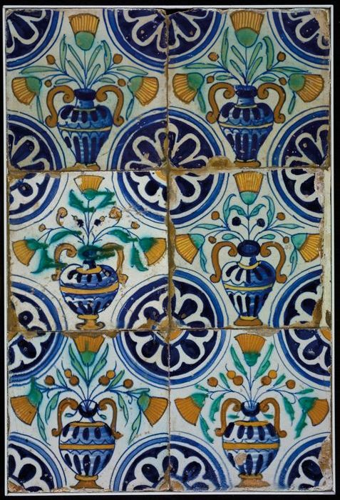Tegelveld van zes bloempotten, hoekmotief kwartrozet...