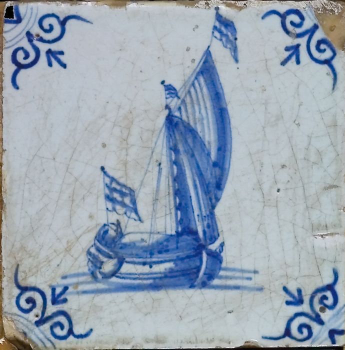 Tafereeltegel uit tegelveld, blauw, zeilschip, hoekm...