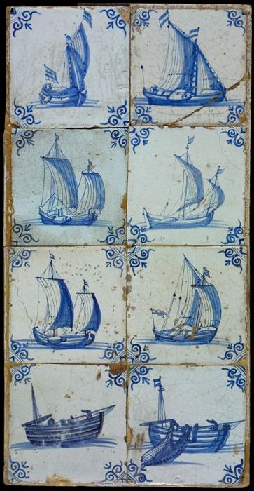 Tegelveld van acht scheepvaarttaferelen, blauw op wi...