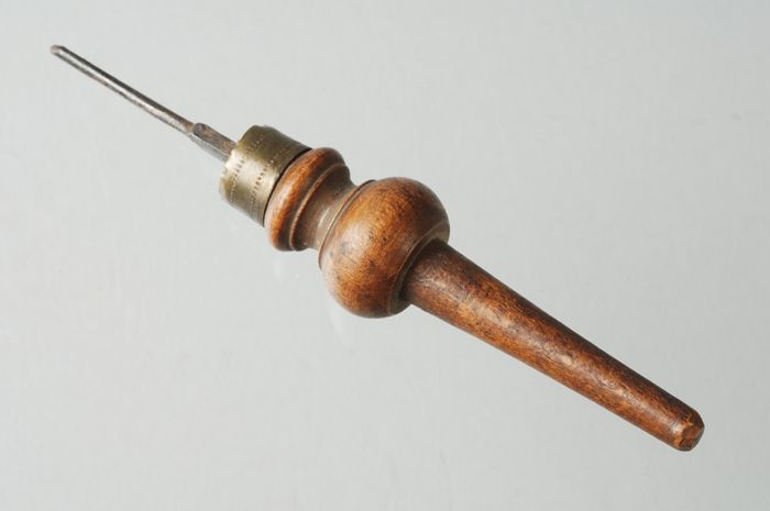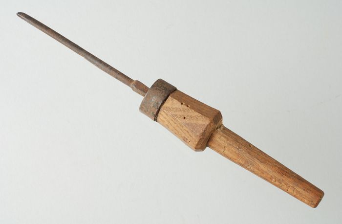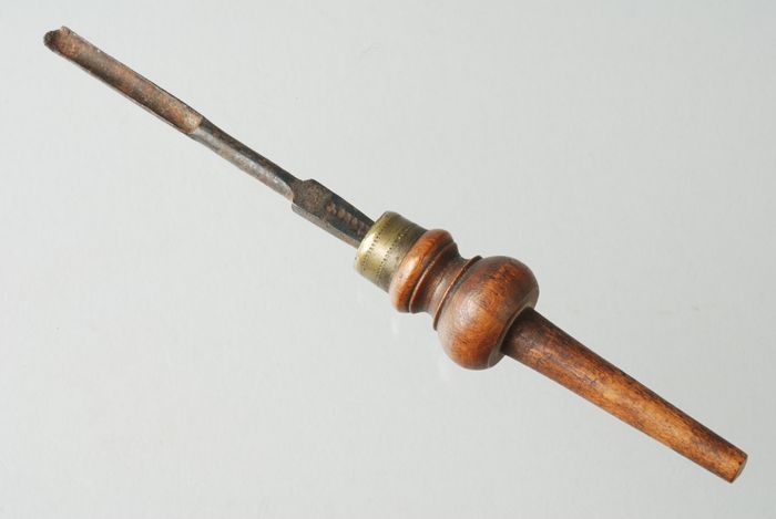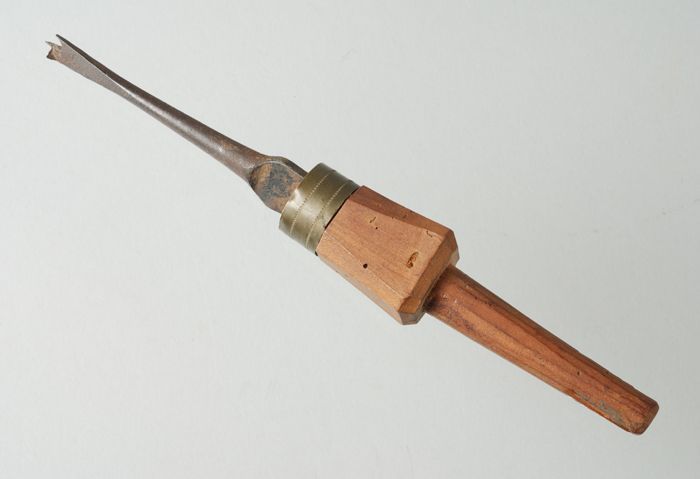 Lepelboor, gevat in houten stok, gereedschap van een...