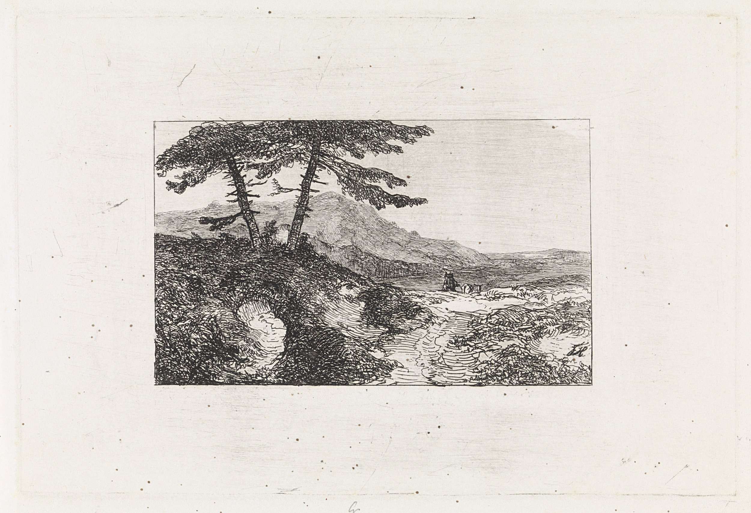 Landschap met twee dennen op een heuvel