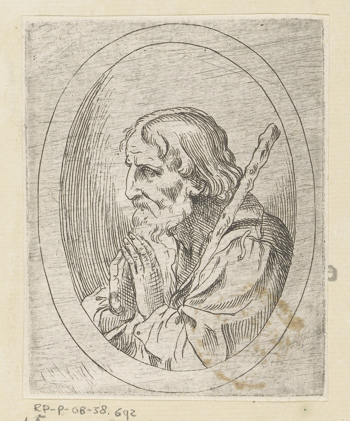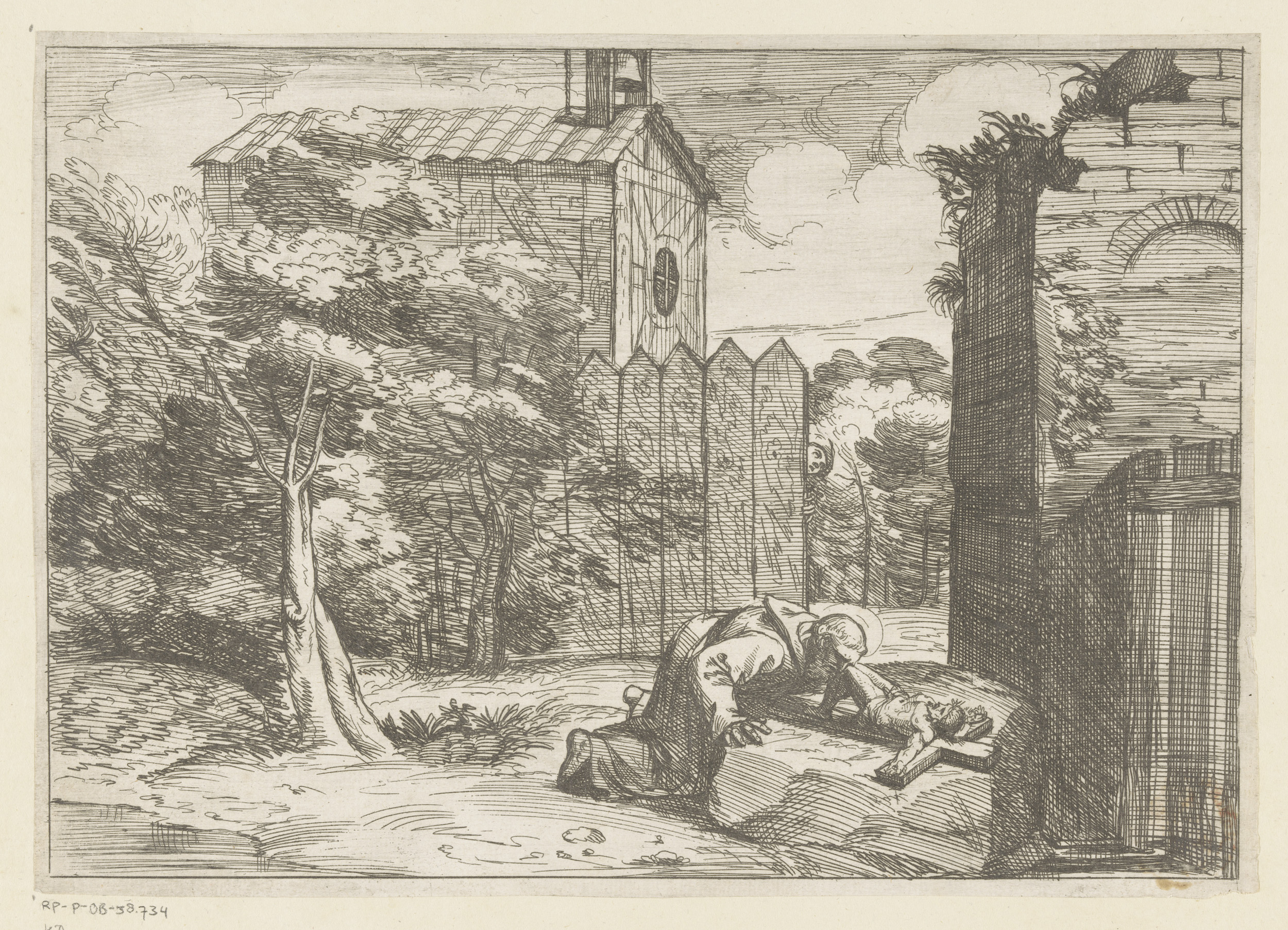 Heilige knielend bij een crucifix